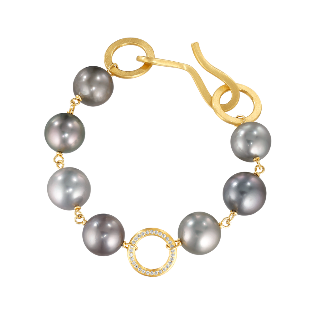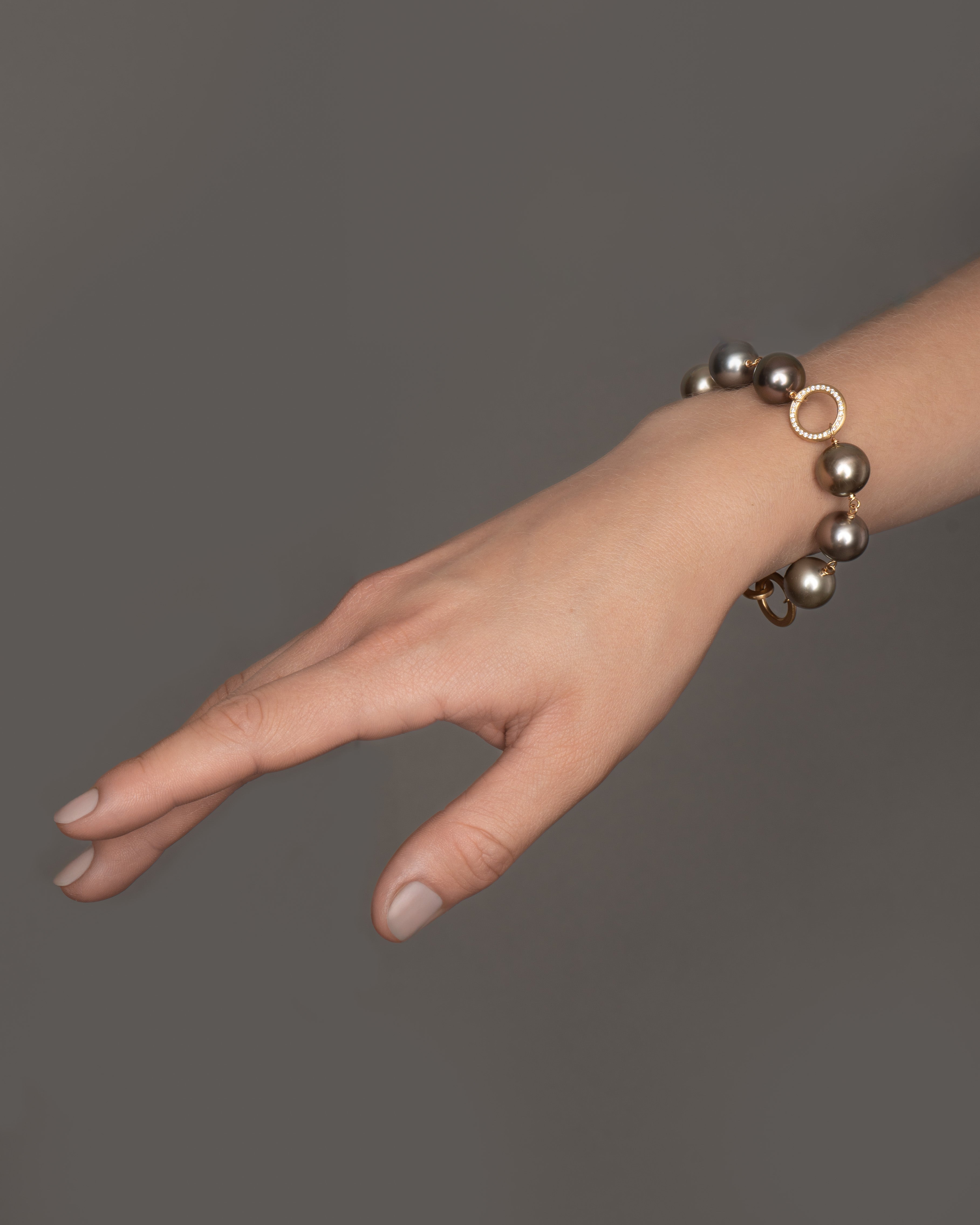 Anello armbåndet er en markant komposition af store, mørke Tahiti-perler, viklet på en tråd af 18k guld, med 60 brillantslebne diamanter, i alt 0,34 ct., F/G, VS2, Ex. Cut., nedstukket på begge sider af guldringen i armbåndets midte med en silkeblød, mat overflade.
