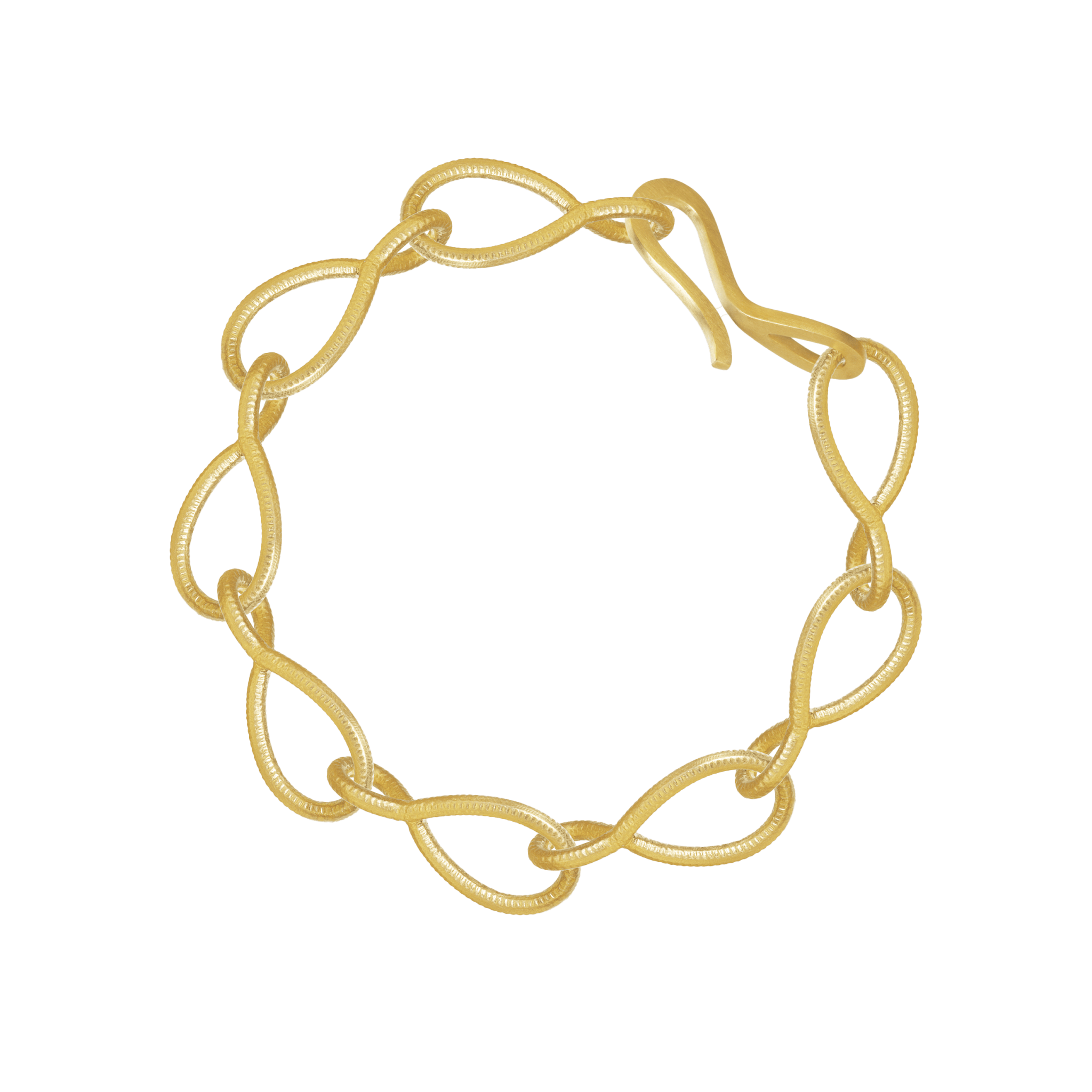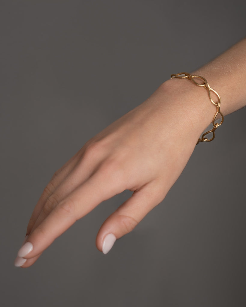 Kharisma Link armbåndets store åbne led er formgivet, så de følger håndleddets form. Lænkearmbåndet falder derfor smukt på armen og er behageligt at have på. Overfladen er håndfilet og riflet som på de øvrige smykker i Kharisma kollektionen. Armbåndet lukkes med den unikke Dulong lås.
