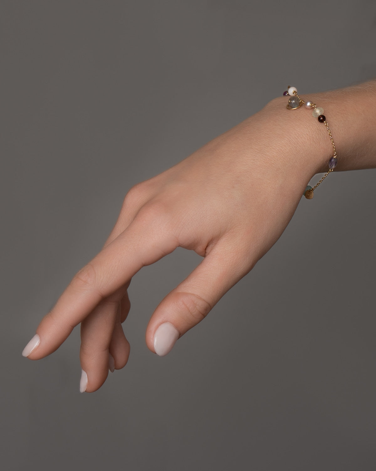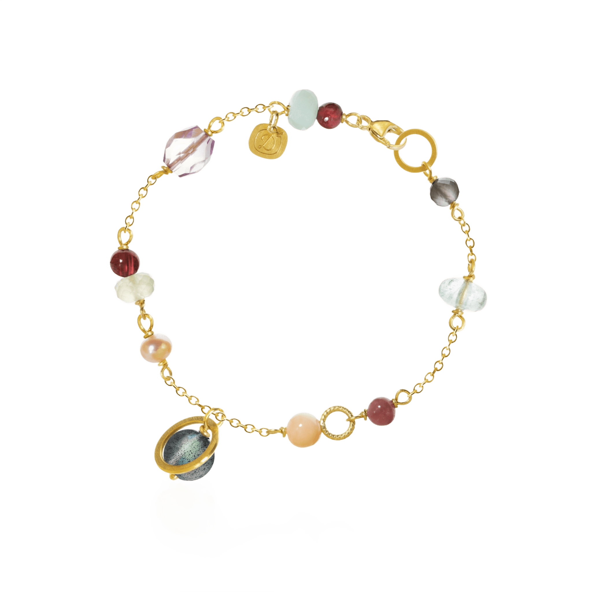Armbåndet indeholder månesten, akvamarin, stjernerubin, lys koral, labradorit, ferskvandsperle, prehnit, calcedon, granat, amazonit og ametyst.