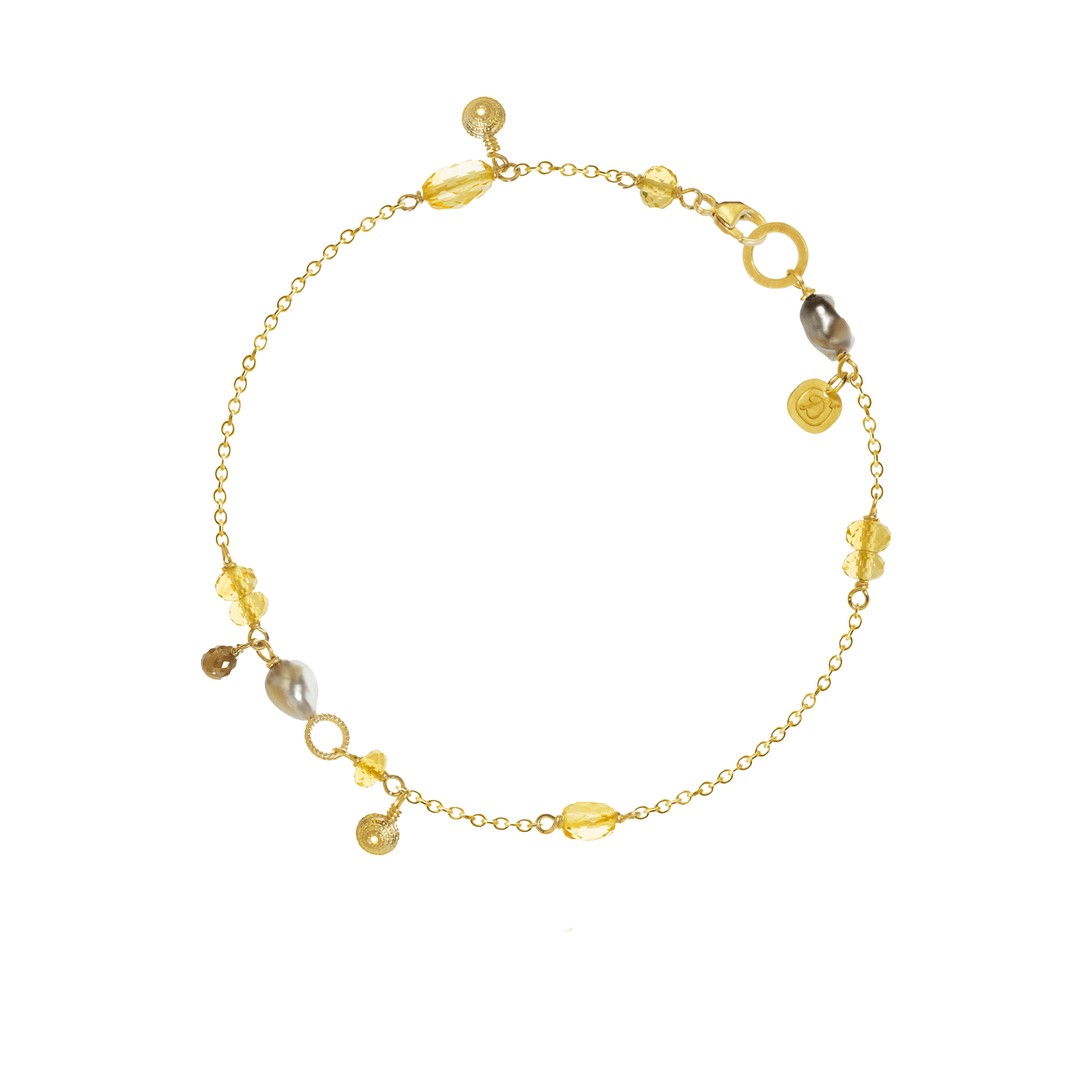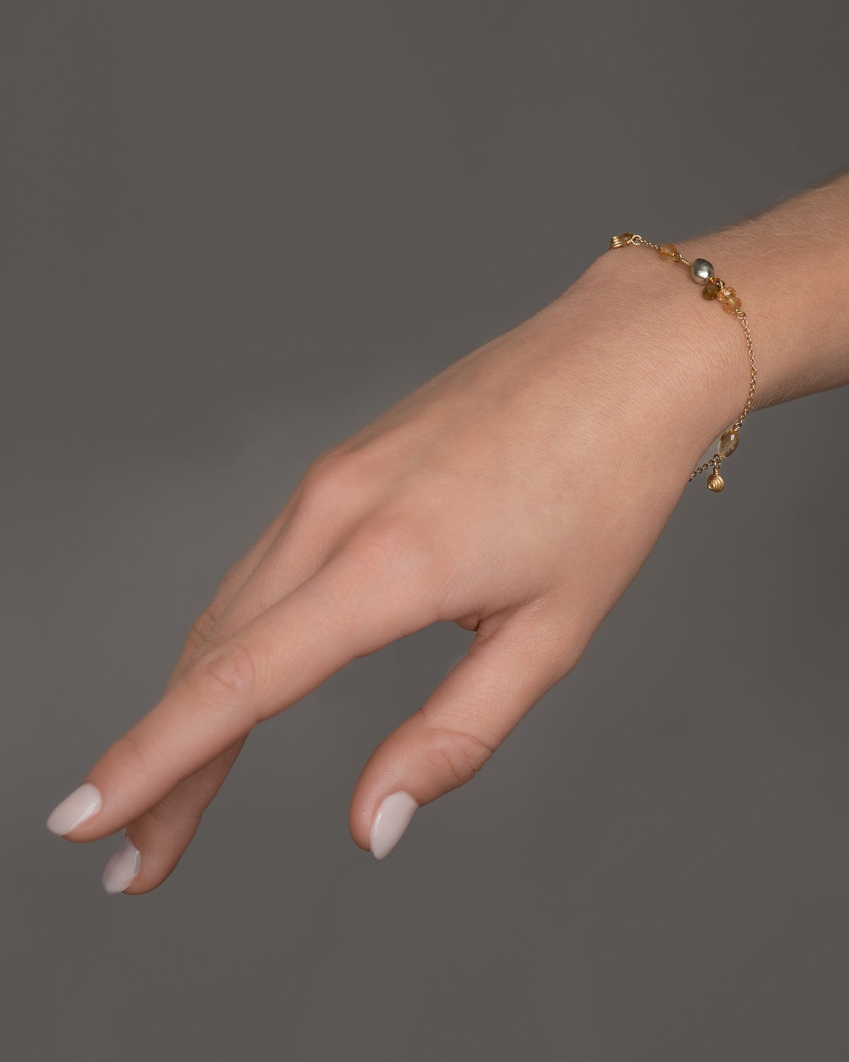 Piccolo Golden Desert armbåndet kommer med briolette-diamant, Tahitiperler, citrin og Thera, som fremhæver guldets skær. Stenene fanger på raffineret vis lyset og har en smuk glød, der komplimenterer hinanden i et smukt og gyldent udtryk.