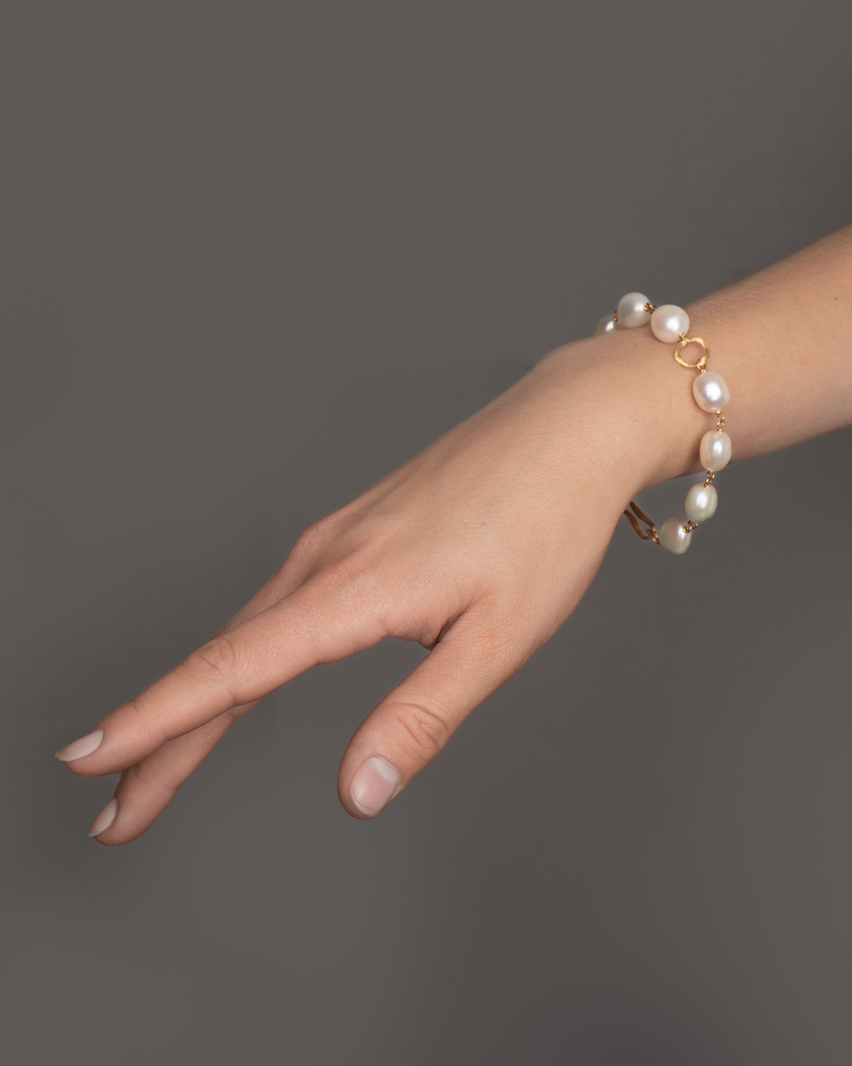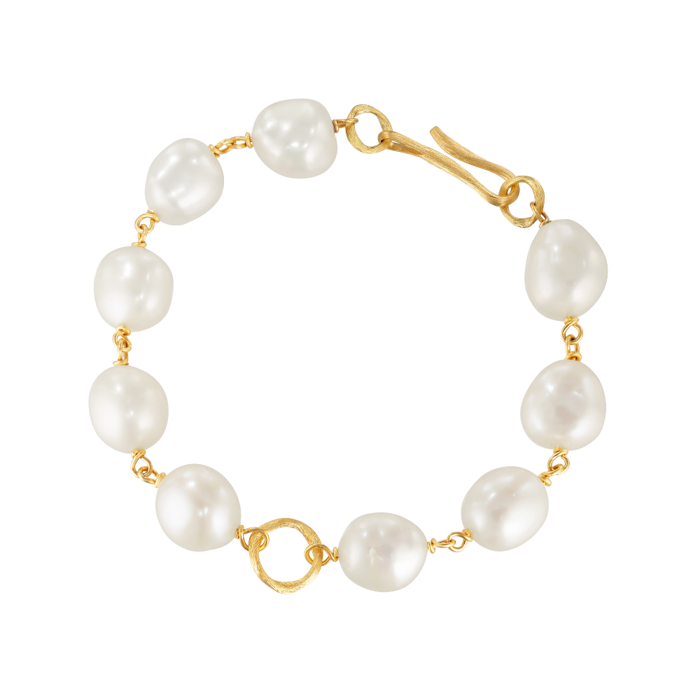 Perlerne er nøje udvalgt af Marianne Dulong for deres særlige glød, form og karakter, hvilket gør hver armbånd unikt og personligt. Kombinationen af det varme guld og perlernes klarhed skaber et ungdommeligt og blødt udtryk.