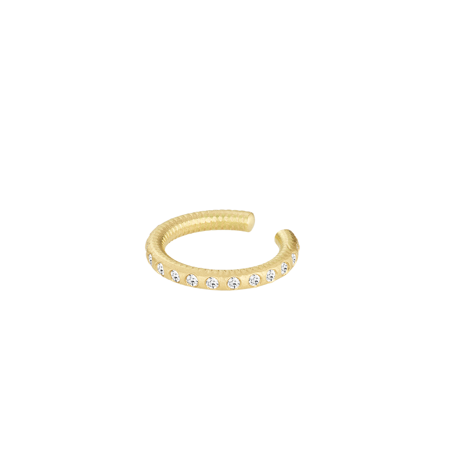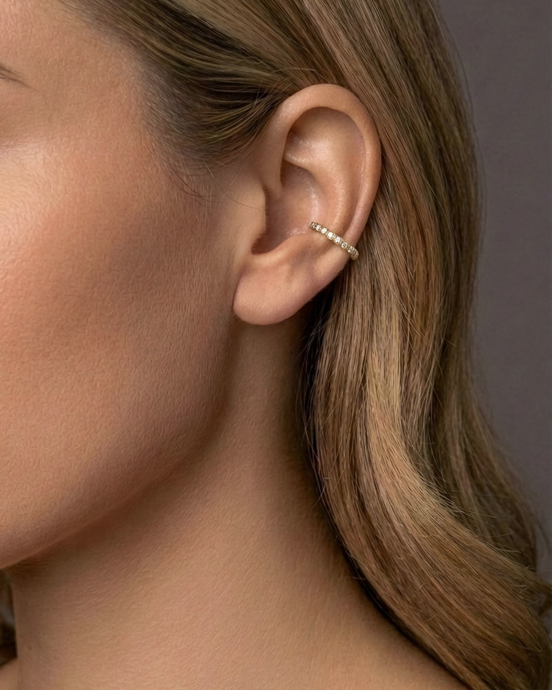 Esme Diamond Cuff i 18K guld er sat med 20 brillantslebne diamanter, i alt 0,10 ct. Den minimalistiske, skulpturelle form hviler let langs øret og tilføjer en diskret linje af lys, der også komplementerer andre smykker.