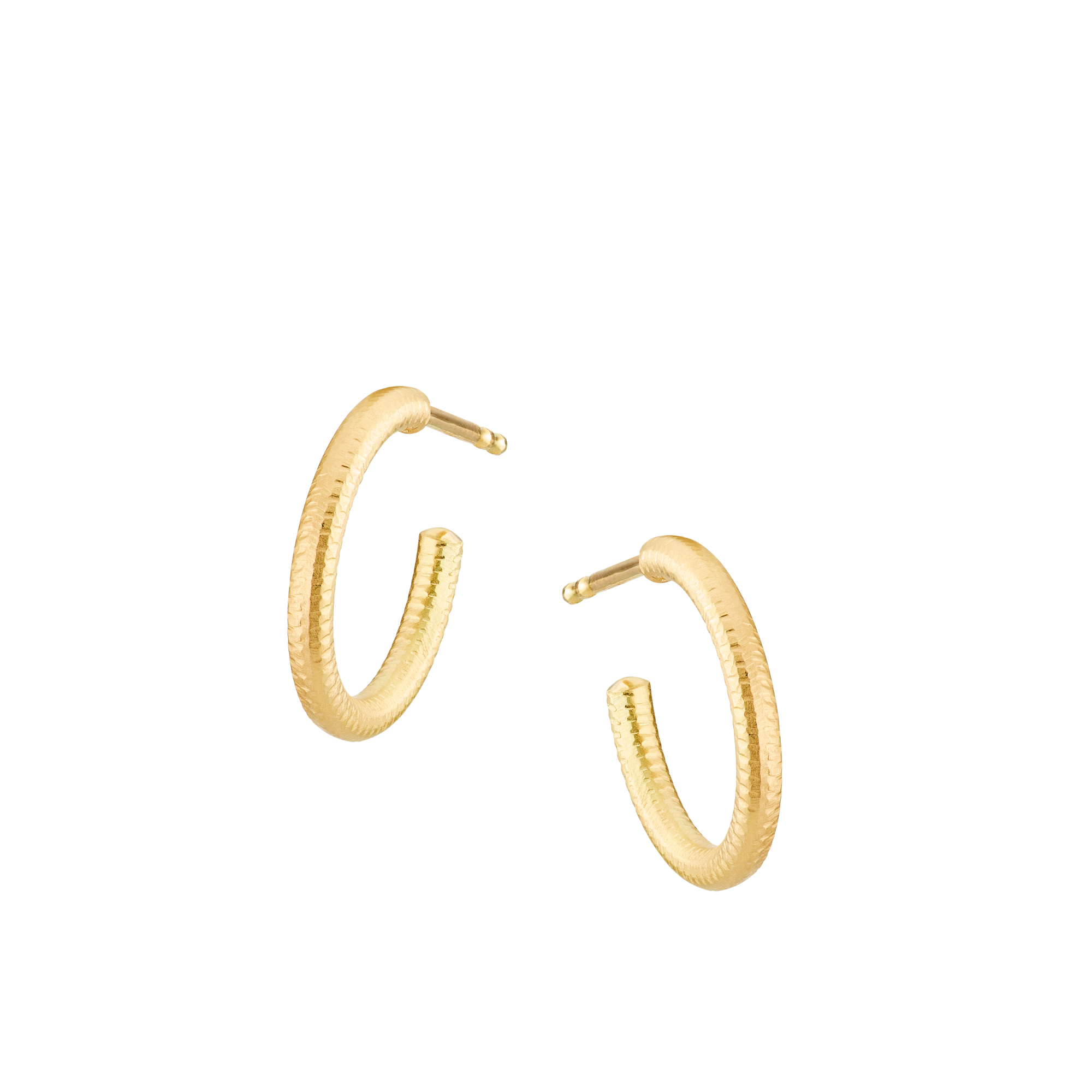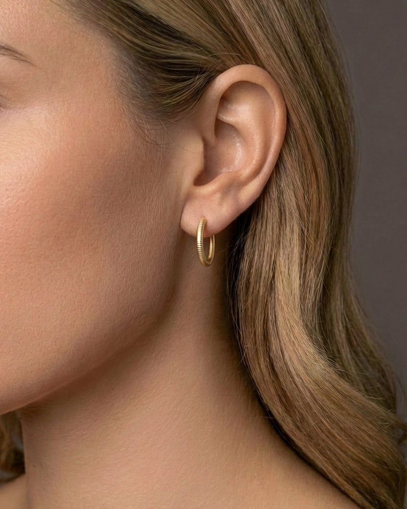 Øreringene er udført i 18K guld og afsluttet med Dulongs karakteristiske filede overflade. Den håndfilede struktur giver guldet sin levende karakter og fanger lyset på en diskret måde.