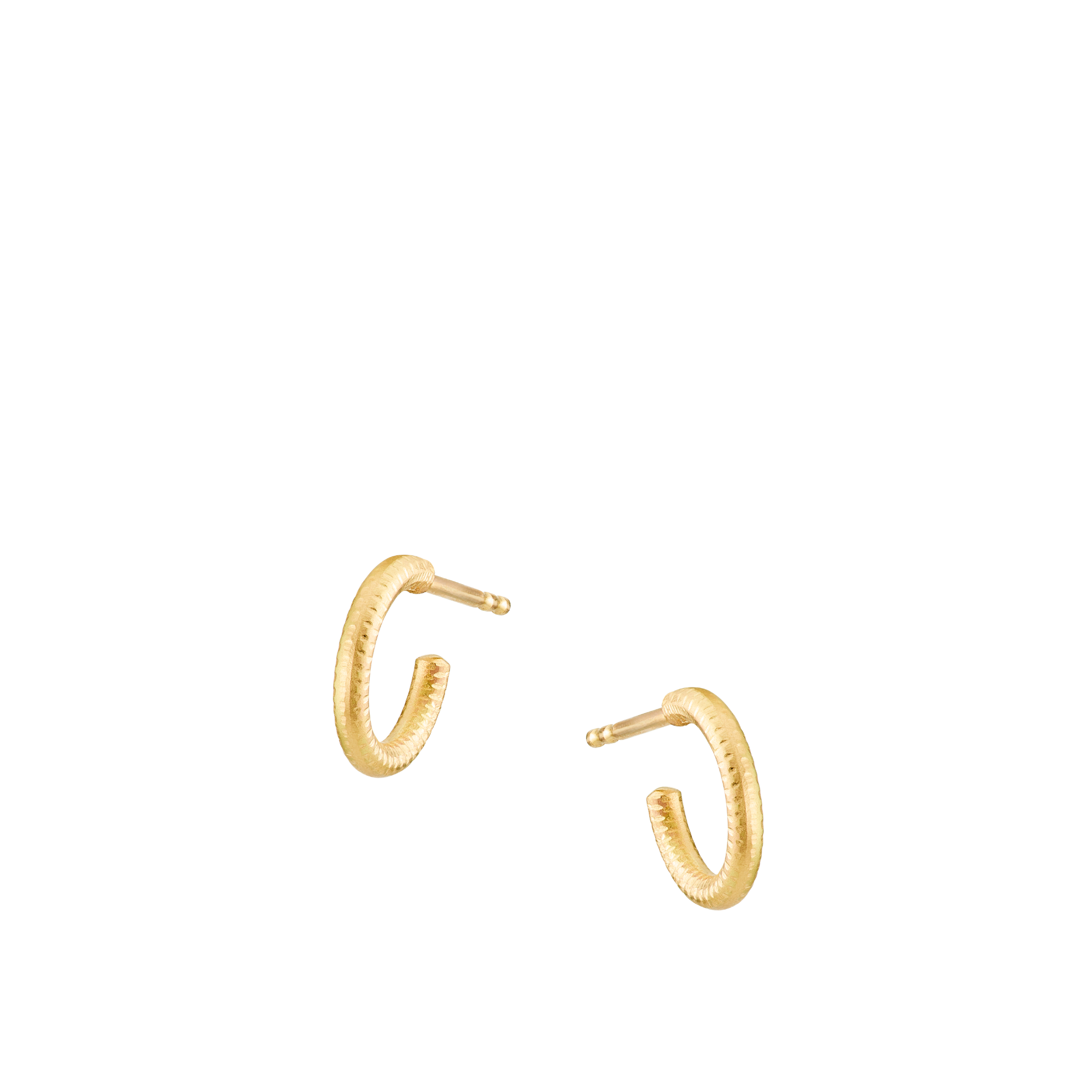 Øreringene er udført i 18K guld og afsluttet med Dulongs karakteristiske filede overflade. Den håndfilede struktur giver guldet sin levende karakter og lader lyset spille diskret i overfladen.