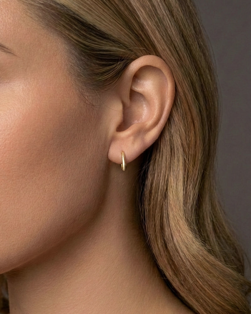 Den klassiske cirkulære form følger ørets naturlige linje og giver øreringene et enkelt med eksklusivt udtryk, der gør dem oplagte til daglig brug.