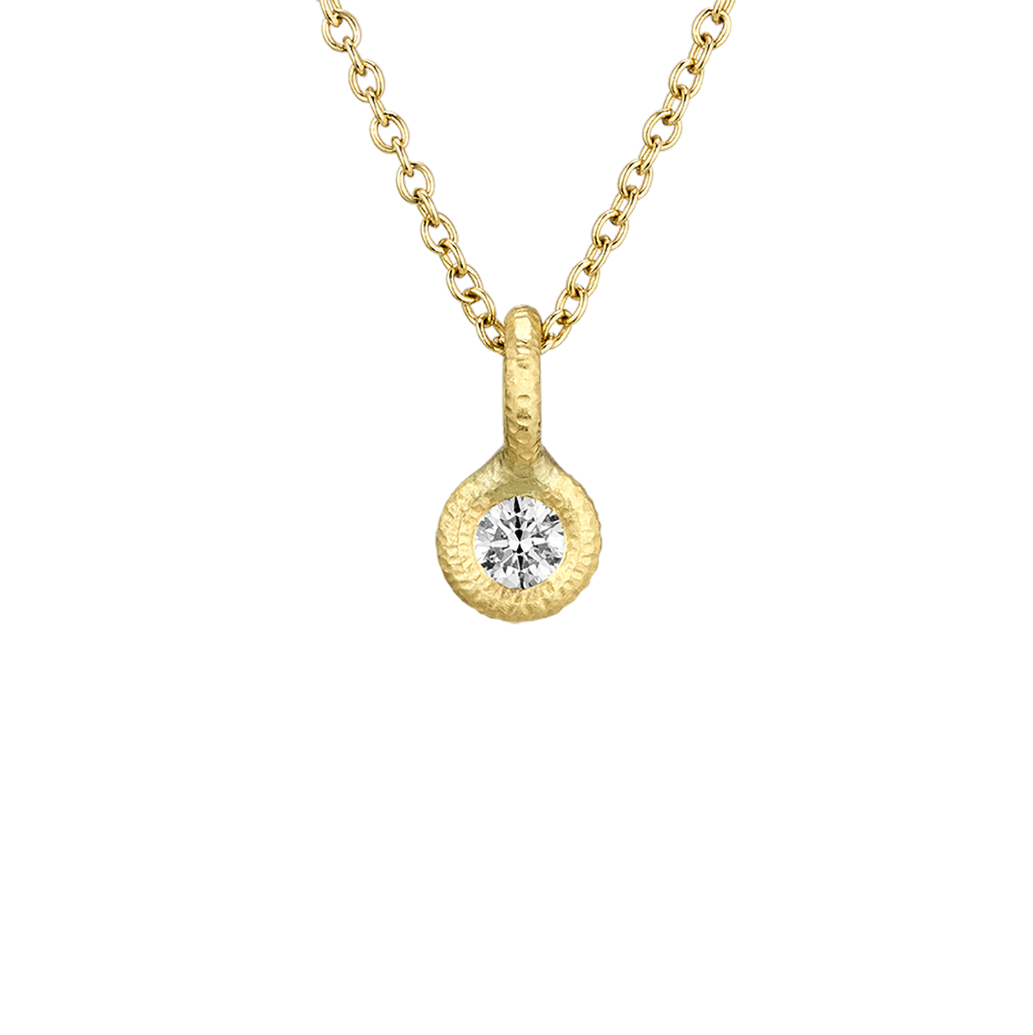 Diamanten er omfavnet af en cirkulær guldfatning, håndfilet af Dulongs guldsmede. Den karakteristiske filede overflade giver vedhænget sin rå og samtidig elegante karakter, hvor guldet reflekterer lyset omkring diamantens glans.