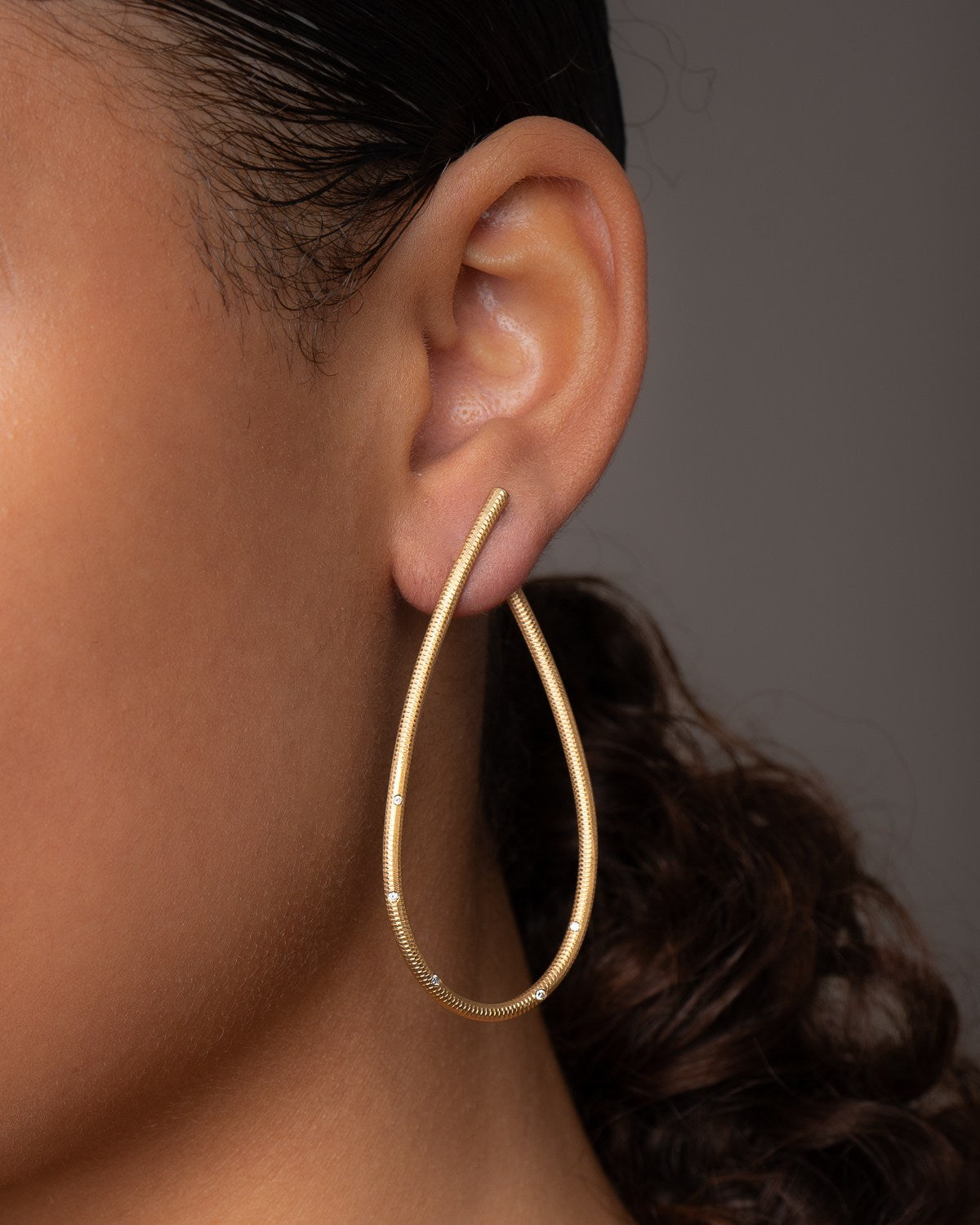 Kharisma øreringe i størrelse mega er til dig, der er vild med det ekstraordinære. Den høje, slanke bue med brillanter bliver endnu mere dramatisk, når den tilføres vedhæng med perler eller smukke sten.