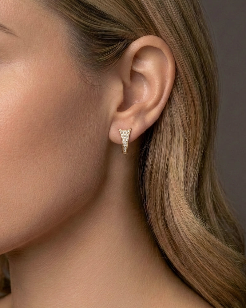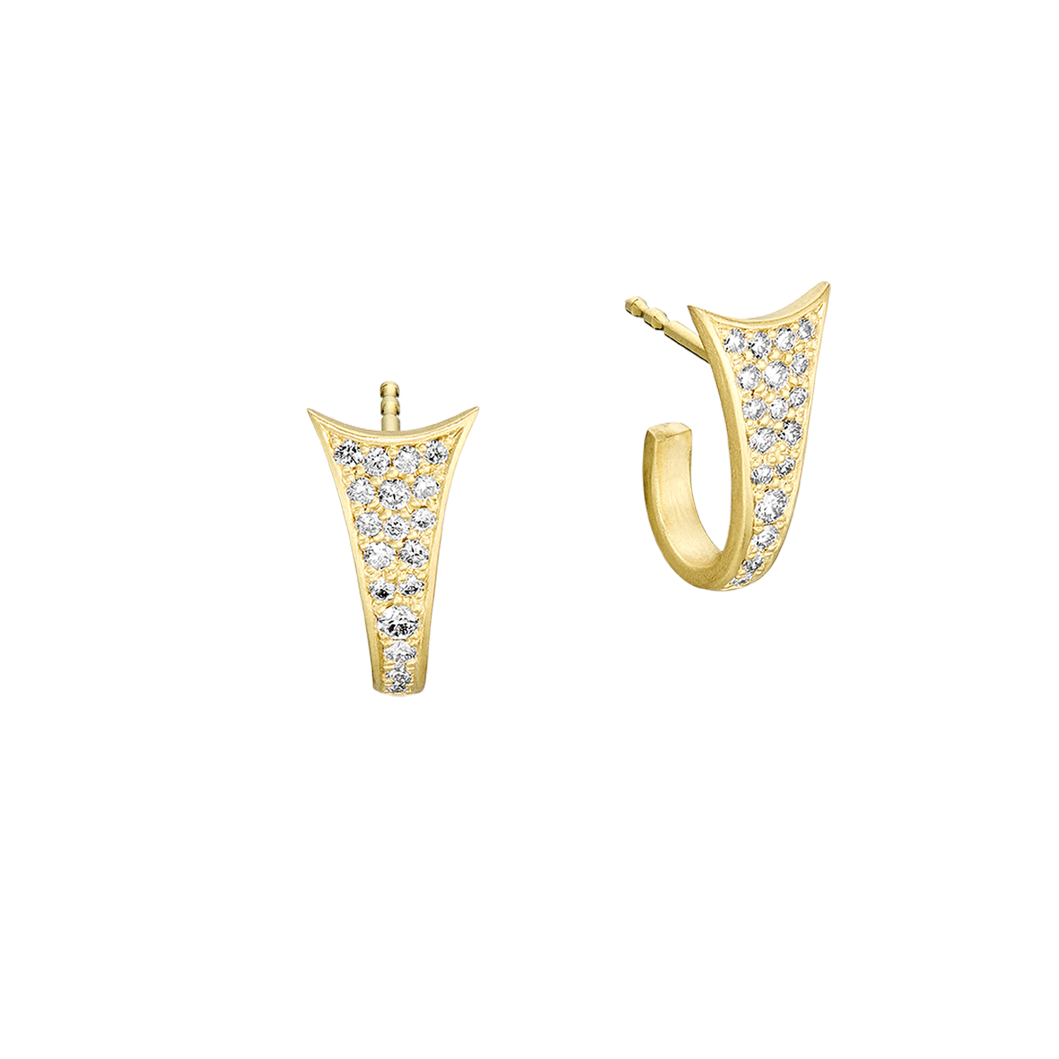 Øreringene er udført i 18K guld og formet med bløde, flydende linjer. Pavéfattede brillanter følger overfladen og fanger lyset i hver bevægelse, hvilket fremhæver designets skulpturelle karakter.