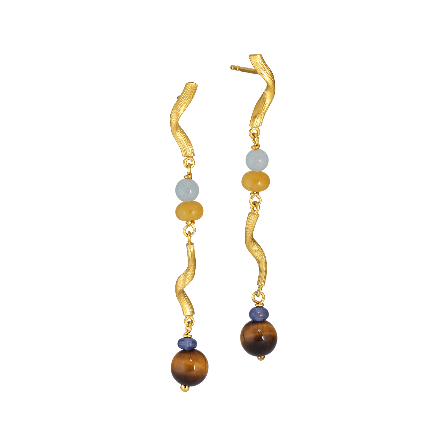 Tigerøje, safir, gul aventurin og trolleit tilfører et diskret spil af farver og bevægelse, når stenene fanger lyset og sender en varm glød tilbage mod huden.