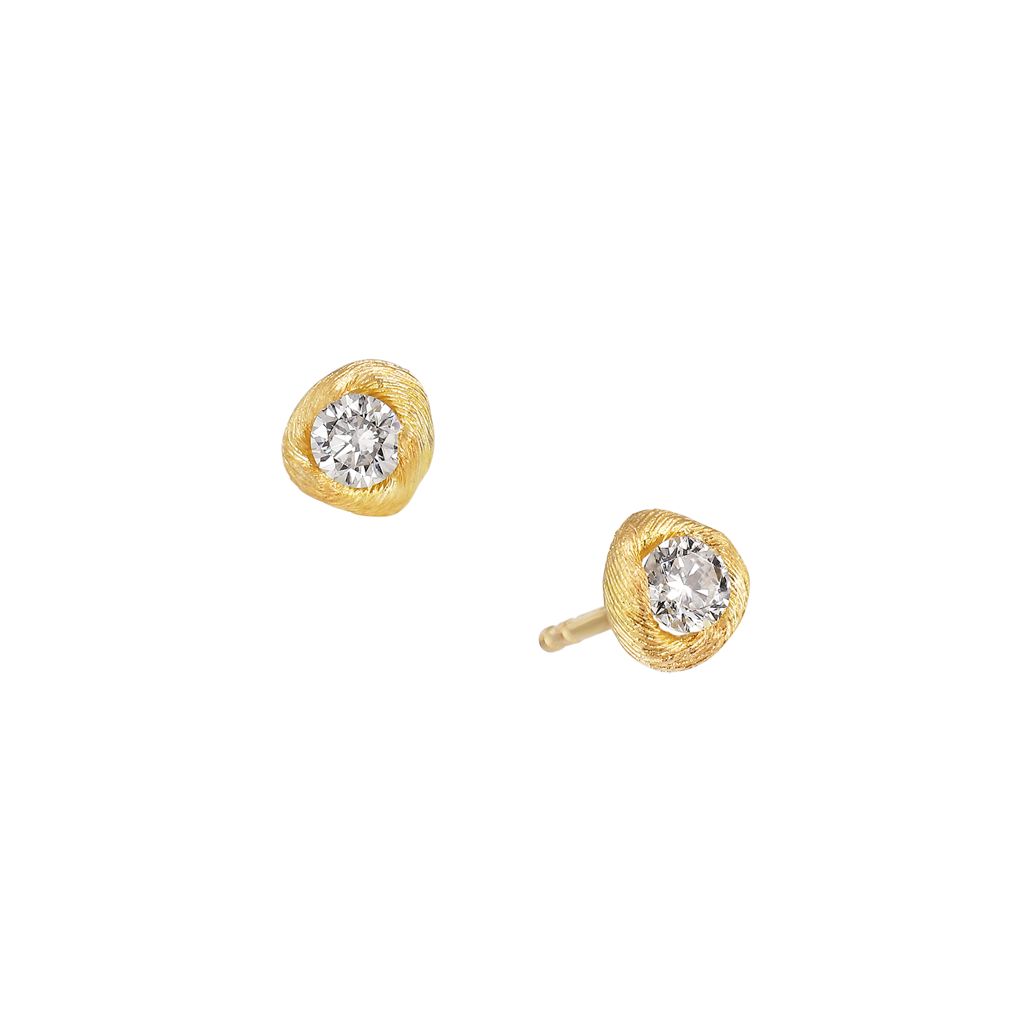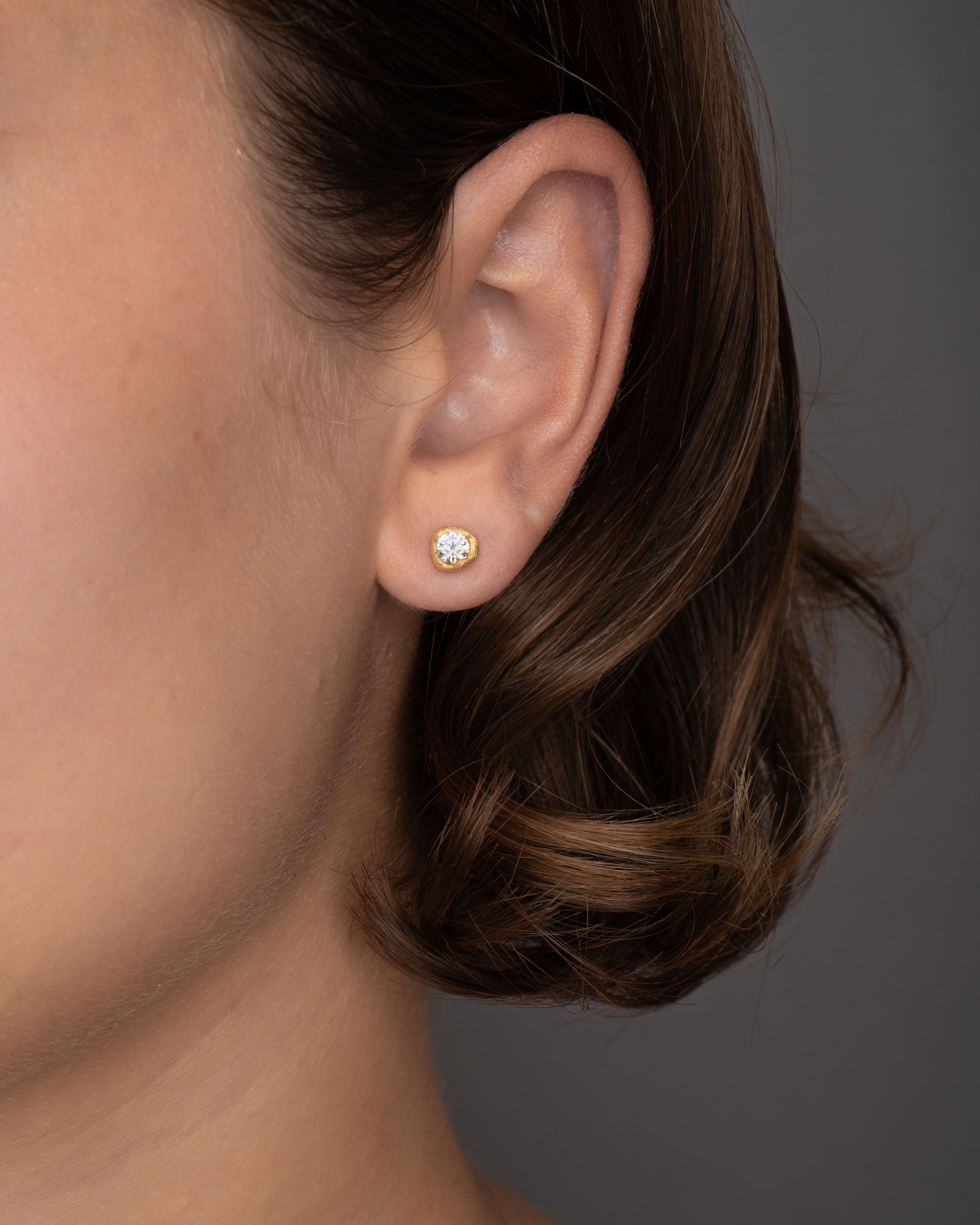 Med deres stjernelignende glans synes diamanterne at løfte sig og svæve i den bløde, organiske krans af børstet guld. Designet skaber en illusion af en flydende bevægelse, hvor diamanterne skinner med intensitet samtidig med, at de lægger sig yndefuldt mod øret.