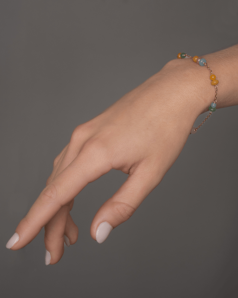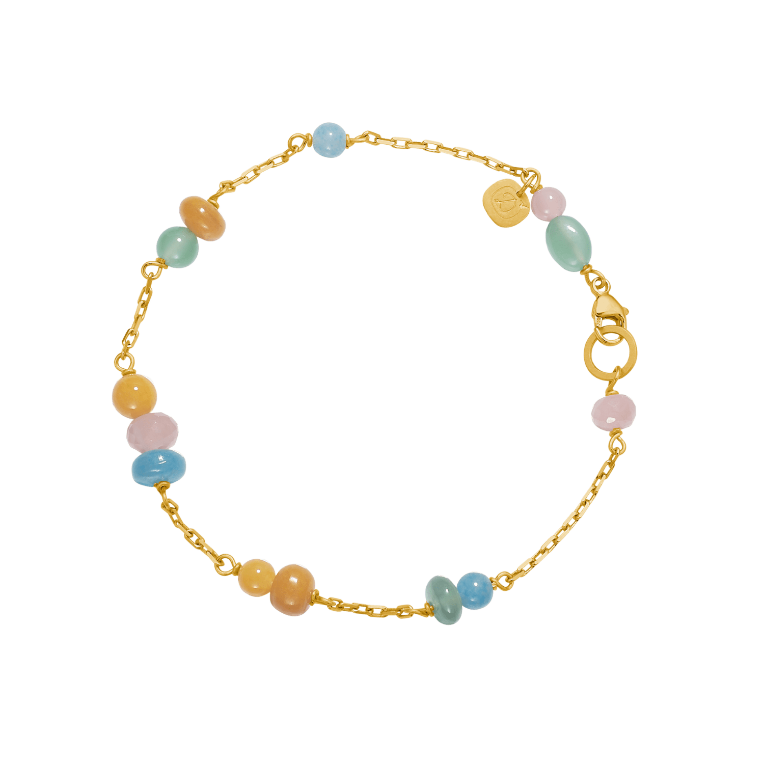 Catena kædernes facetterede led giver Piccolo Melrose armbåndet et fyldigt og kraftfuldt udtryk. Kæden brydes af sektioner af blanke perler i aventurin, trolleit og guavakvarts, i en glad farveskala som spejler sommerens farver. Ædelstenene er omhyggeligt udvalgt med inspiration fra afslappede sommerdage i 70’ernes Californien.