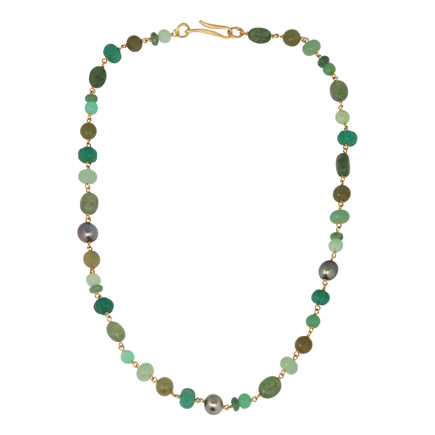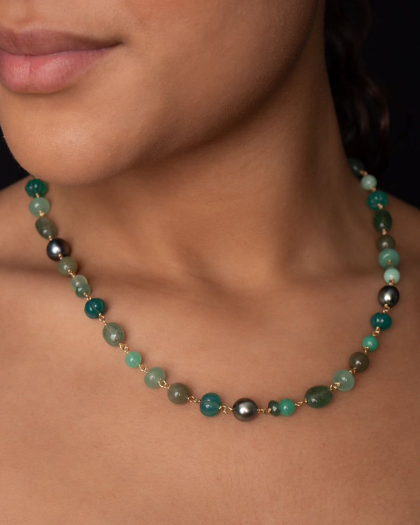 Med hver bevægelse veksler de grønne nuancer fra jade til salvie, mens perlernes mørke glans skaber en stille kontrast. Uden at blive for dominerende, fremtræder farverne harmonisk og efterlader huden med et glødende skær.