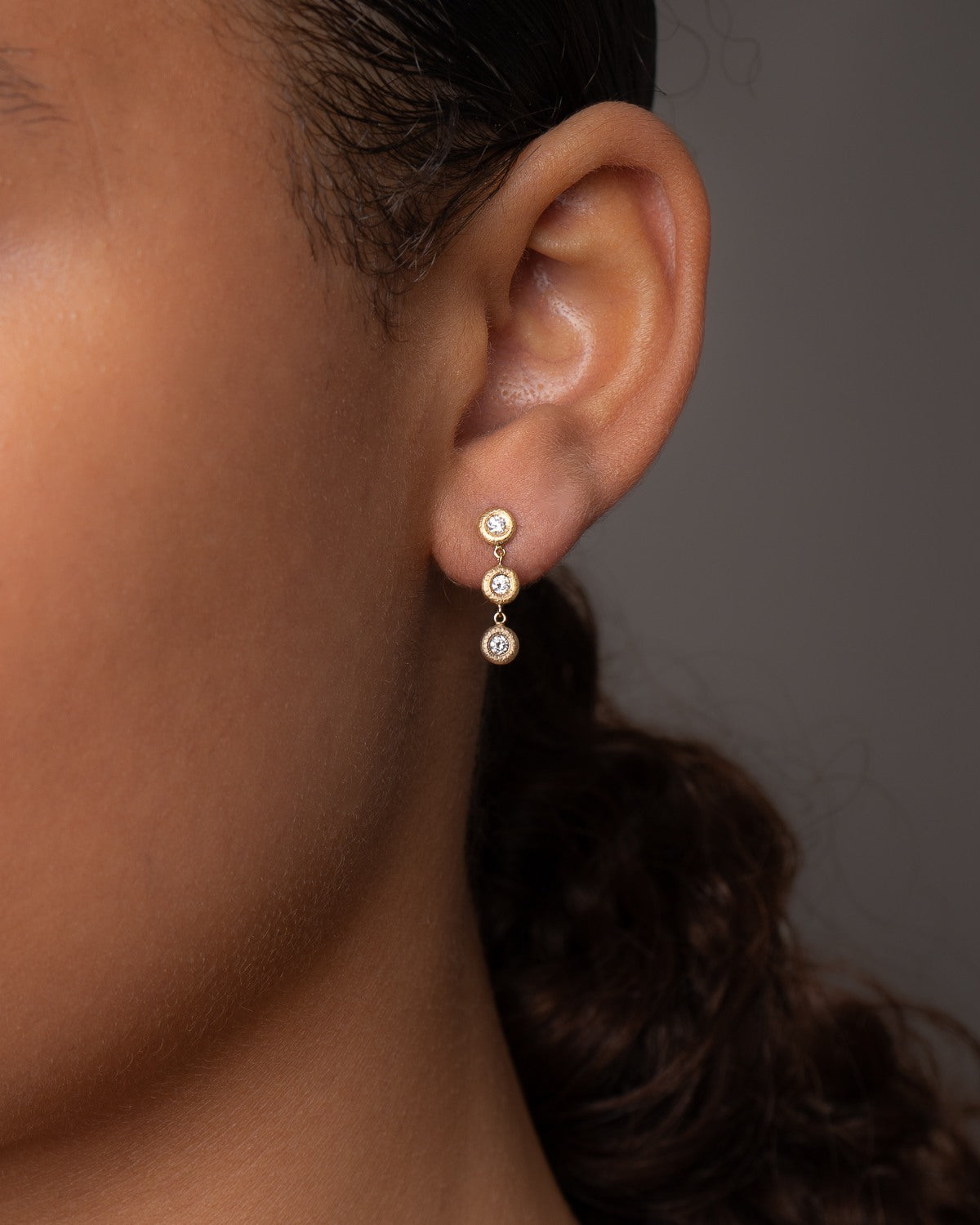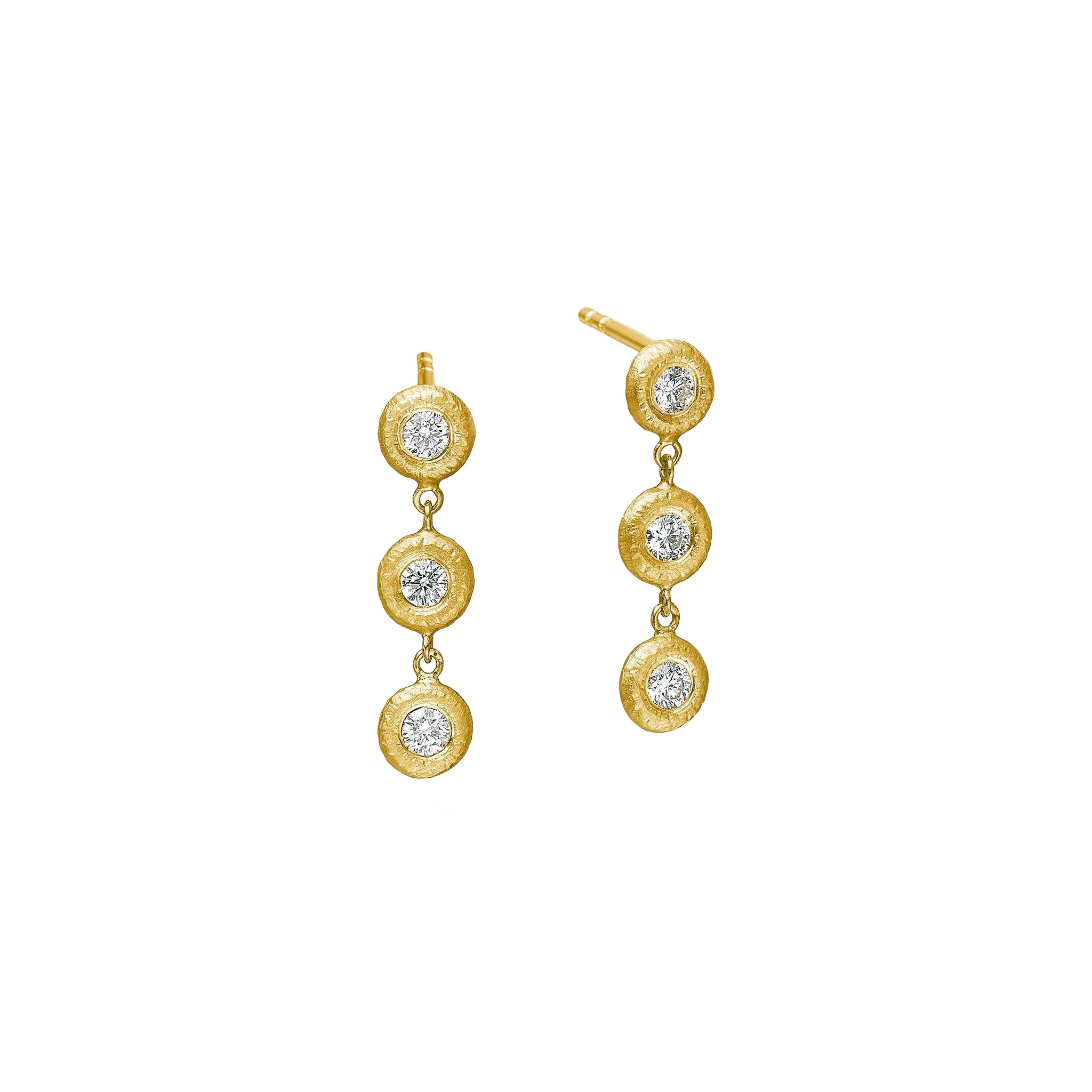 Elegante ørestikker med tre små, brillantslebne diamanter på hver 0,04 ct. Hver diamant er omkranset af en cirkel af guld med vores håndfilede, riflede signaturoverflade. Guldets rå overflade giver et særligt liv til de glamourøse diamanters refleksion af lyset.