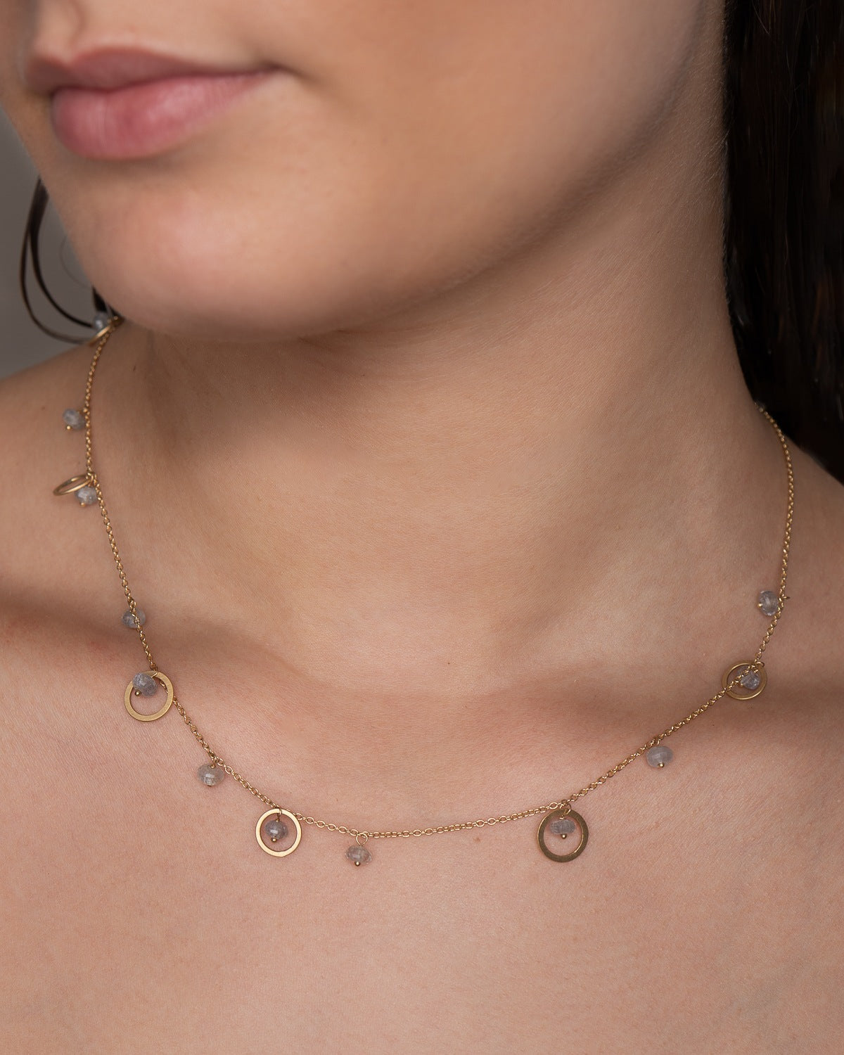 Den klassiske Piccolo Meadow halskæde er skabt med de fineste gråblå facetslebne safirer og håndlavede delikate ringe i forskellige størrelser, som hænger som små lysende glorier og skaber et på én gang funklende og klassisk udtryk.