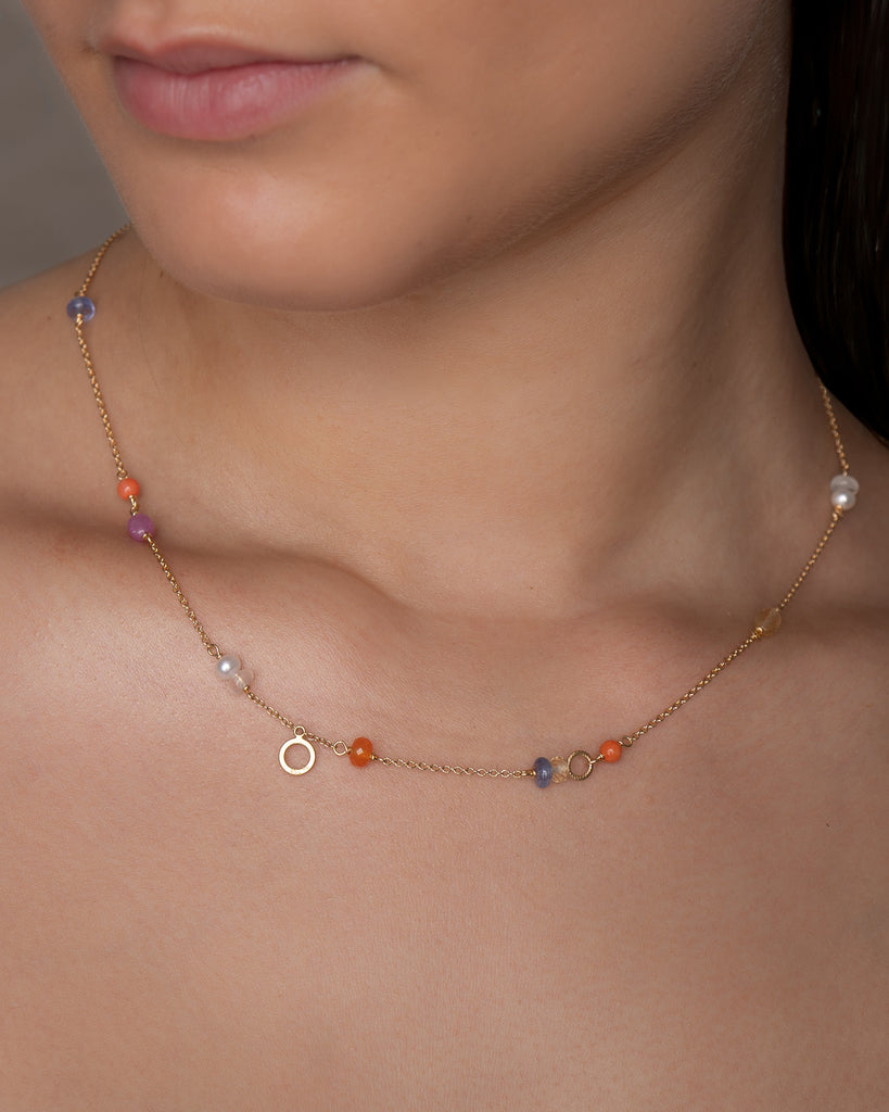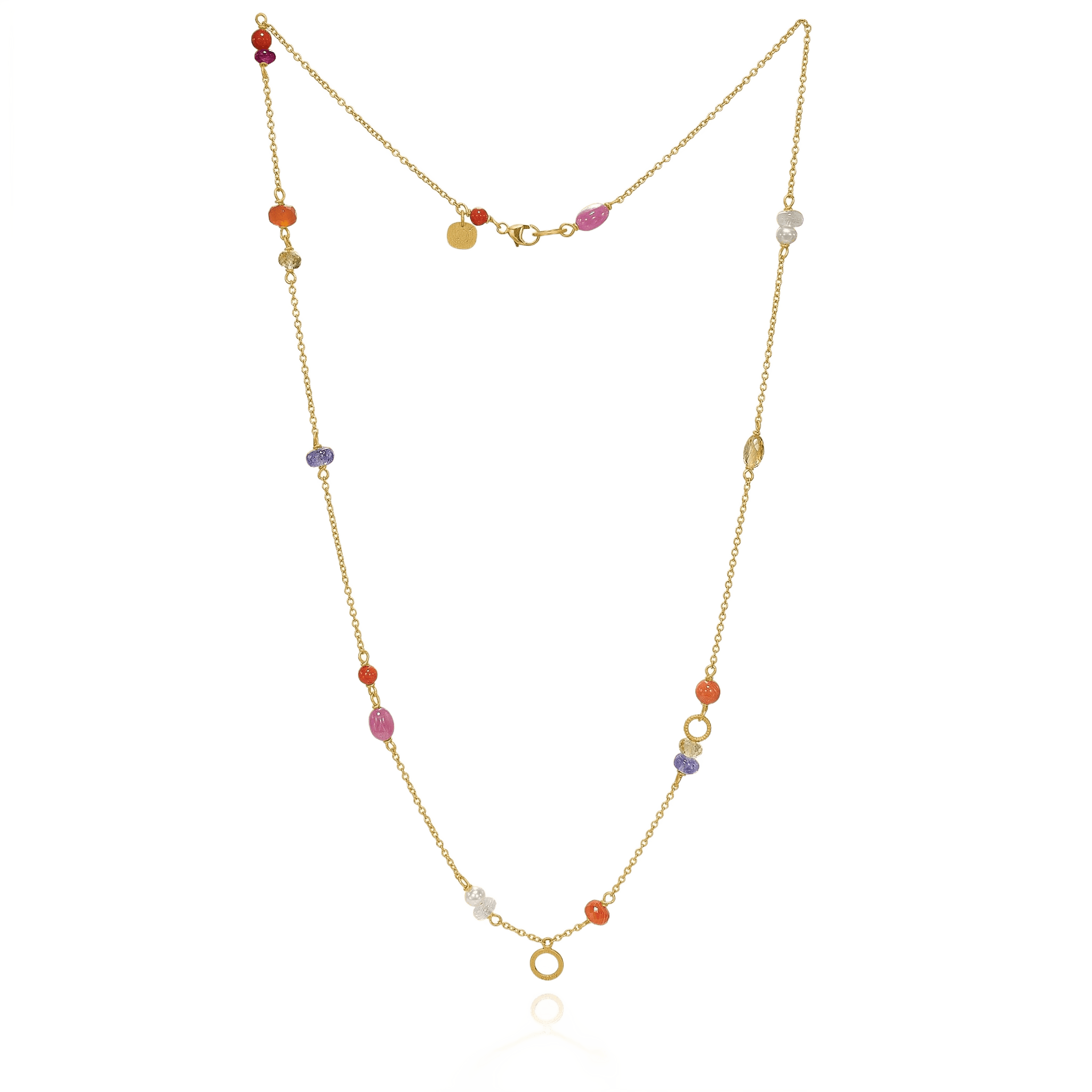 Halskædens farverige ædelsten og håndfilede detaljer komplimenteres og fremhæves af en enkel kæde.