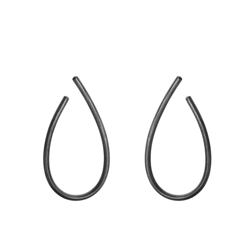 I den store størrelse er kurven perfekt dråbeformet. Kharisma øreringene kommer i fire forskellige materialer: guld 18 K, hvidguld 18 K, oxideret sølv og sølv, samt i fire forskellige størrelser og med brillanter. Bemærk at der er en højre og en venstre ørering og at de skal placeres, så kurven peger væk fra ansigtet.