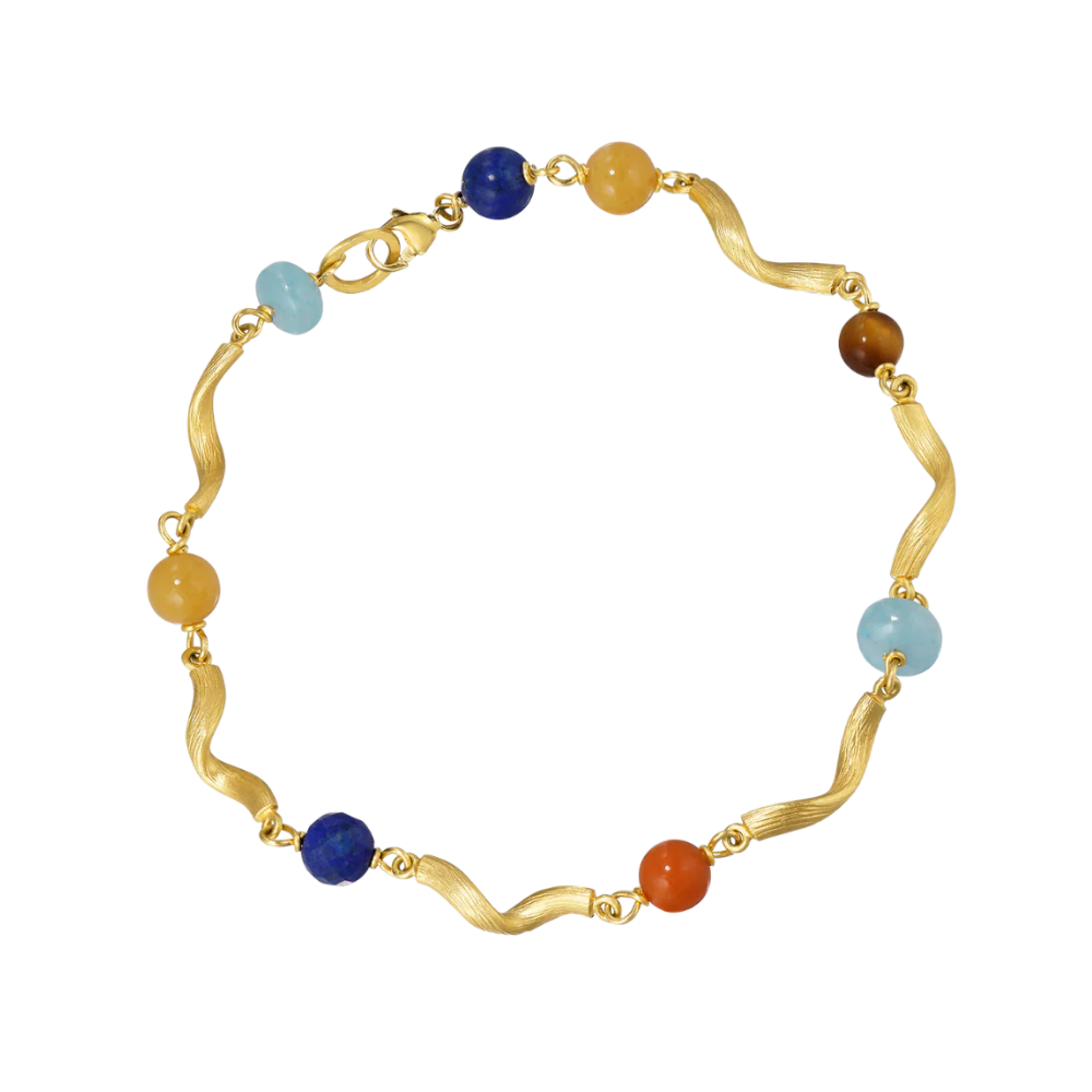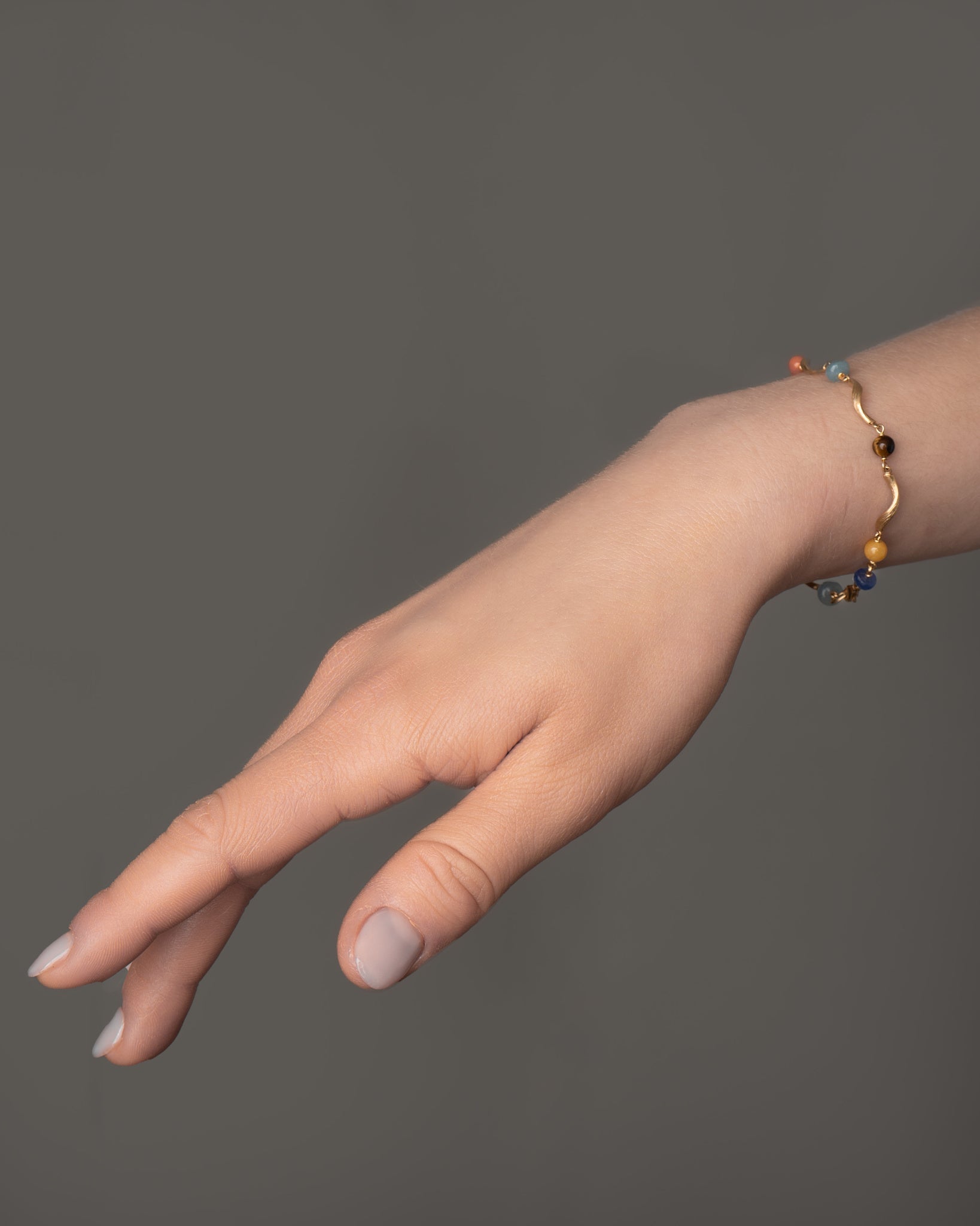 A composition of light, color and movement. The Vega Bracelet unites the characteristic curved gold links of the Vega collection with carefully selected gemstone beads – each chosen for its unique hue and exclusive cut.