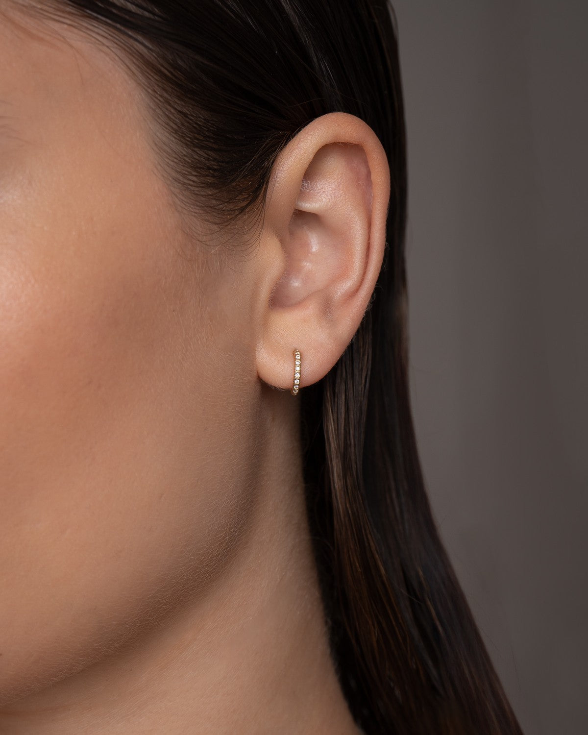 Esme Galaxy øreringene er et uimodståeligt smykke og en håndværksmæssig præstation. Hver lille diamant er placeret perfekt for at skabe en refleksion af lys over ansigtet og signalere klassisk glamour. Den rå, silkematte tekstur er en signatur fra Dulong, der får det bedste frem i den smukke guldnuance. Smykket passer til alt og er en ny-klassiker som kan foræres videre i generationer. Smykket er skabt til at blive båret med andre Dulong smykker på tværs af kollektionerne.