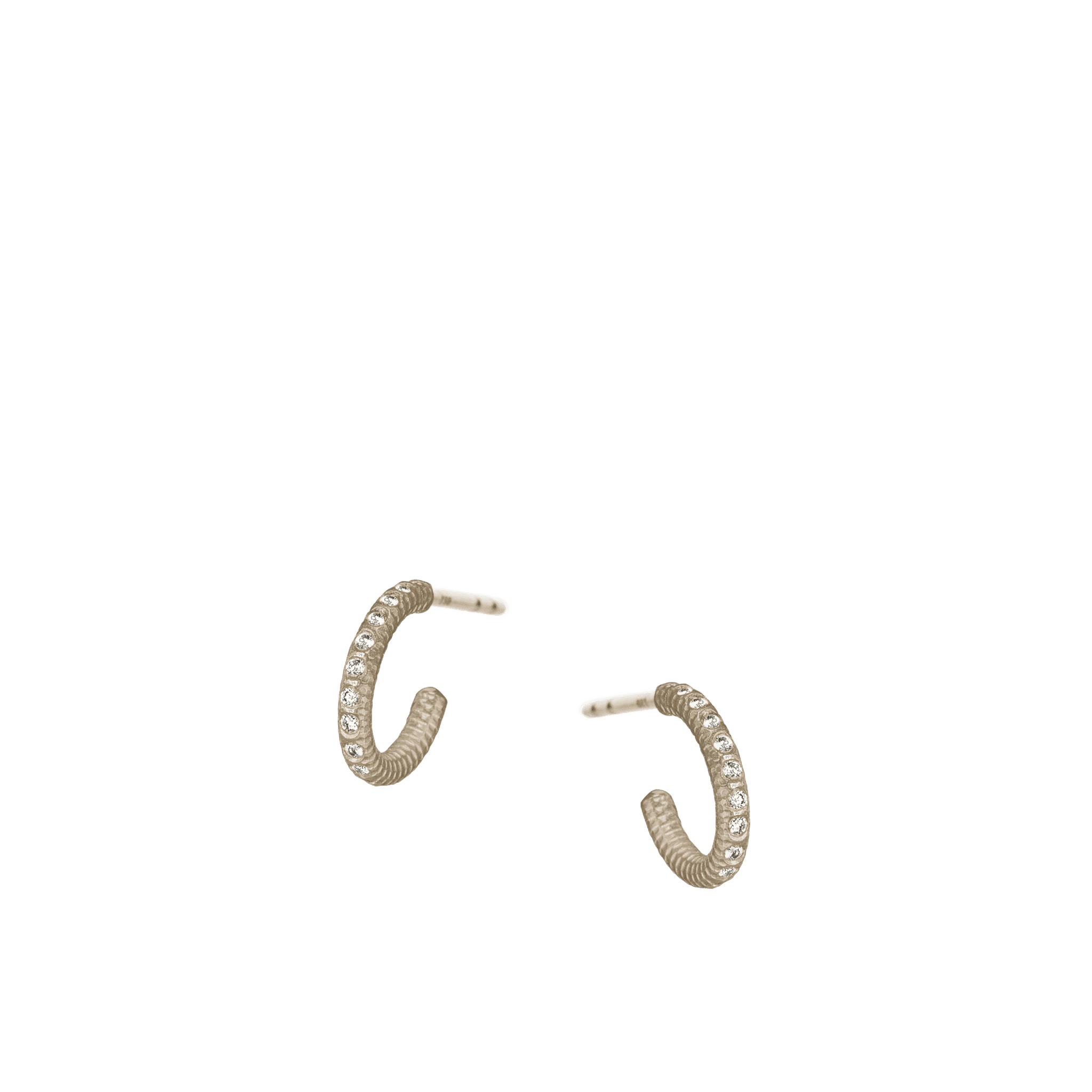 Klassiske, eksklusive creoler øreringe i hvidguld 18 K. Hver ørering er besat med 16 brillantslebne diamanter, indfattet i øreringens yderside. Øreringene er håndfilede og har en rå, silkemat overflade.