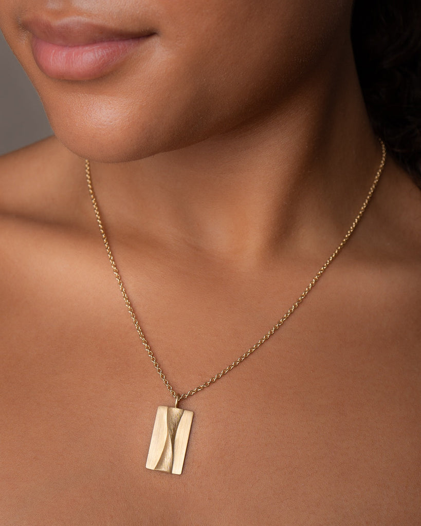 Vega Relief vedhænget er et udtryk for minimalistisk skønhed og håndværksmæssig præcision. Fremstillet i håndlavet 18 karat guld, fremhæves vedhængets geometriske form af bløde, flydende linjer, der giver en subtil kontrast til den matte overflade. Dette vedhæng er en smuk fusion af skulpturel kunst og tidløs elegance.