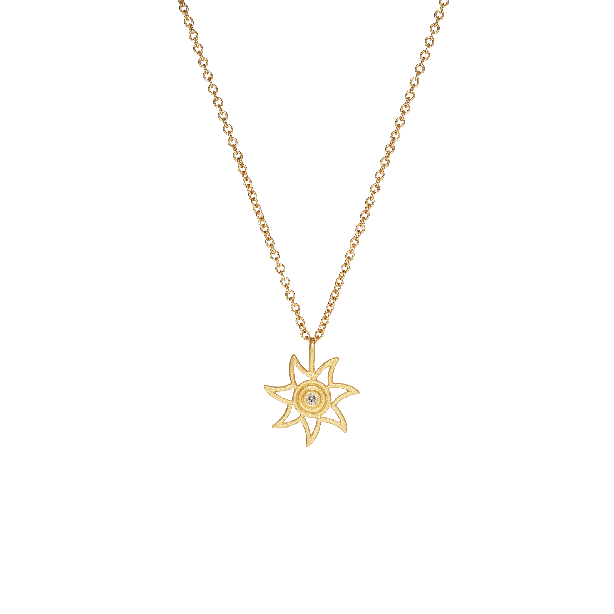 Skabt i 18k guld er vedhænget formet af bølgende solstråler og et spiralmønster — som en stille reference til uendelighed og kontinuitet. En enestående brillantsleben diamant (0,019 ct, F/G, VS, Ex. cut) er placeret i midten og fanger blikket, mens den reflekterer lyset i en elegant, flydende bevægelse.