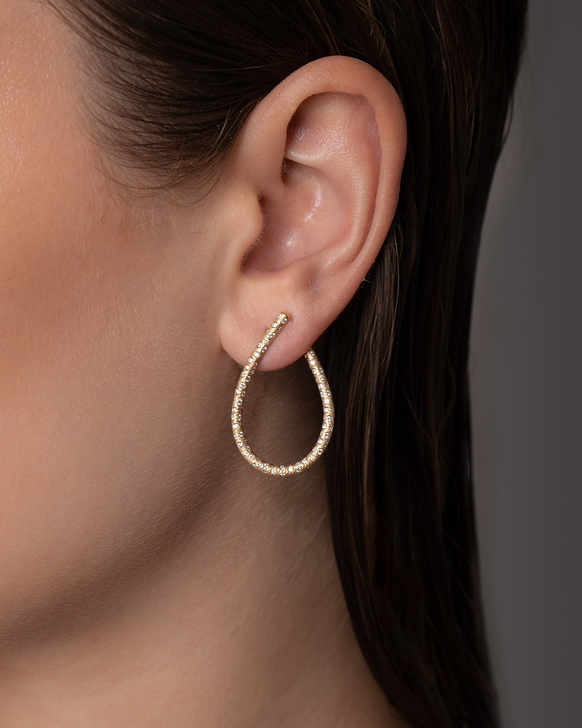 Kharisma Supernova øreringe kommer i guld 18 K og hvidguld 18 K og findes også i en lille størrelse. Bemærk at der er en højre og en venstre ørering og at de skal placeres, så kurven peger væk fra ansigtet.