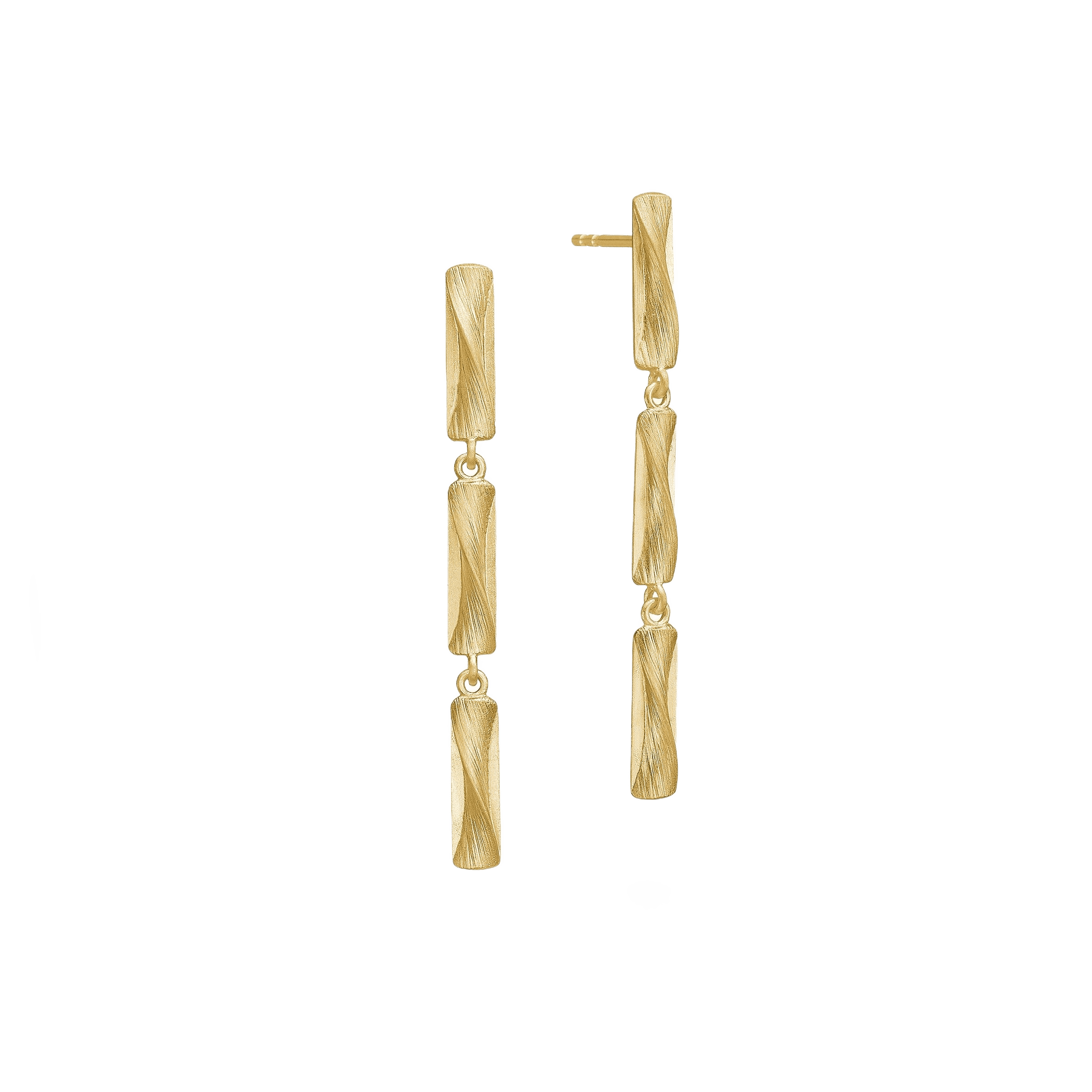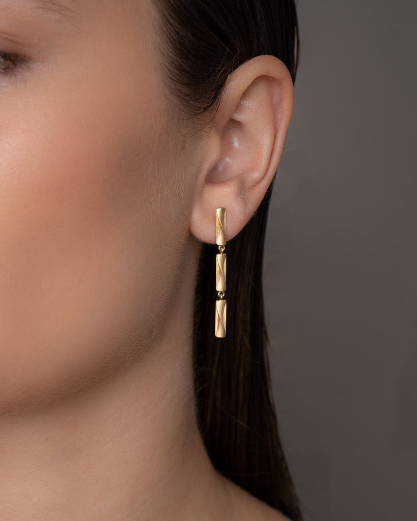 De lange Vega Relief øreringe har tre bevægelige led, hvis små bevægelser og overflader fanger lyset og sender det videre mod ansigtet og halsen, som bliver badet i et gyldent lys.