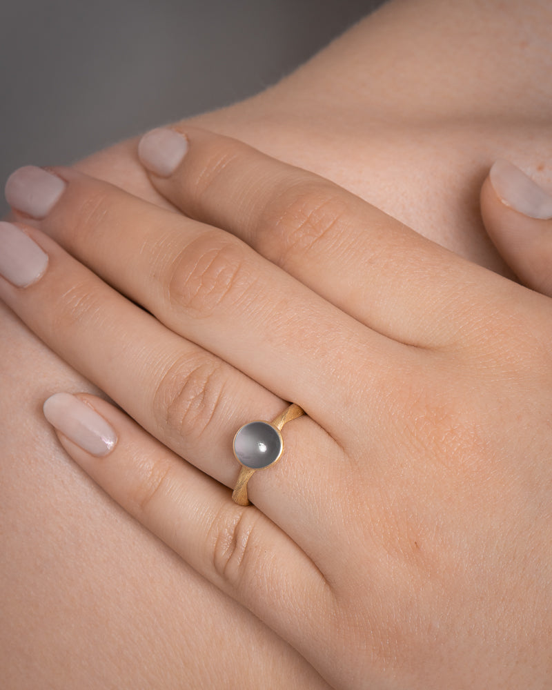 Månesten fremstår med et blidt, skiftende skær, hvor lyset bevæger sig roligt hen over stenens overflade. Dens særlige optiske kvalitet skaber et subtilt lysspil, som synes at svæve inde i stenen frem for at passere direkte igennem den.