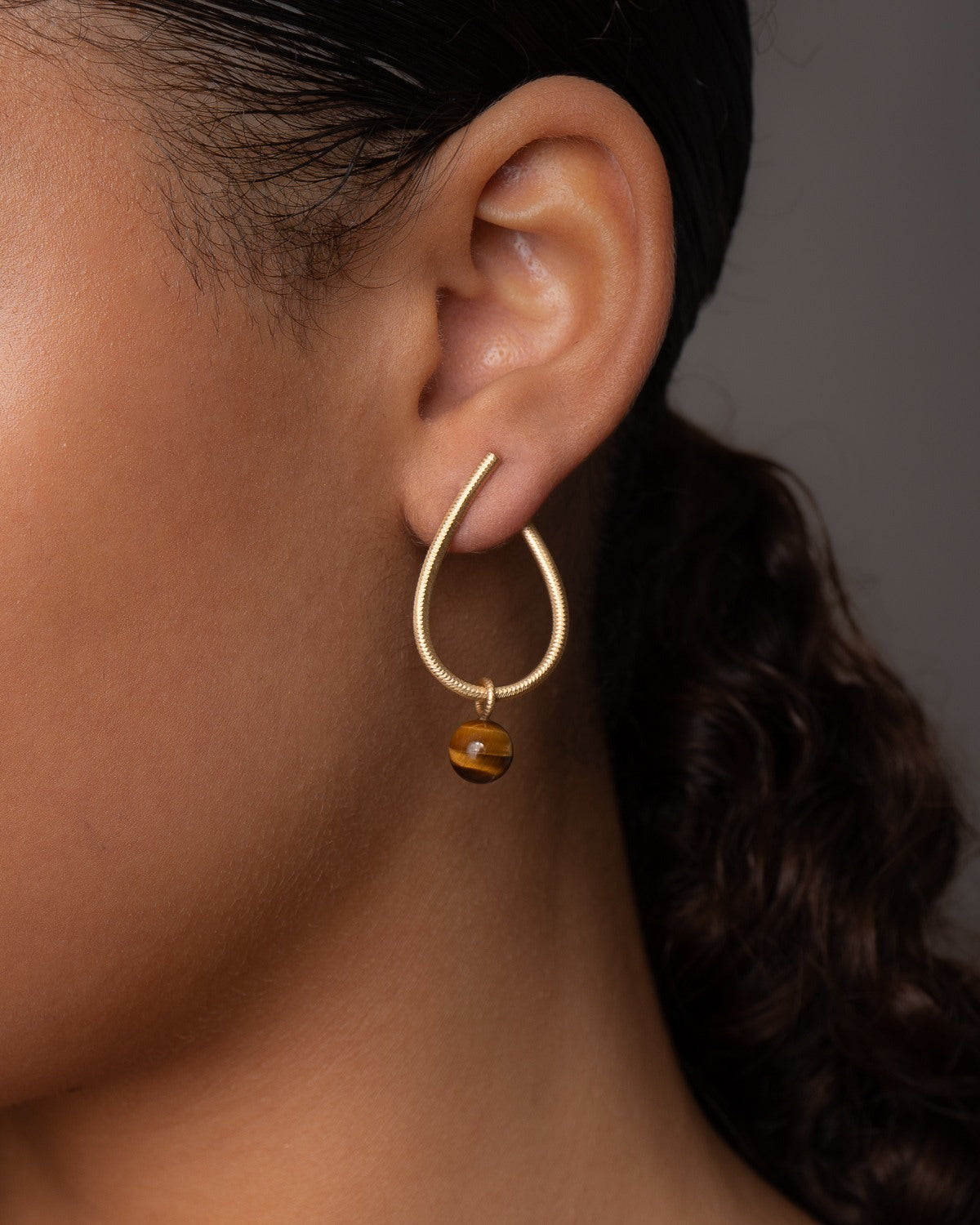 I denne version af Globe har vi brugt tigerøje. Ædelstenen, tigerøje, har dybe næsten hypnotisk sorte, brune og orange farver med nogle markante lysbrud, der er så uimodståeligt dramatiske, at de netop ligner et tigerøje.