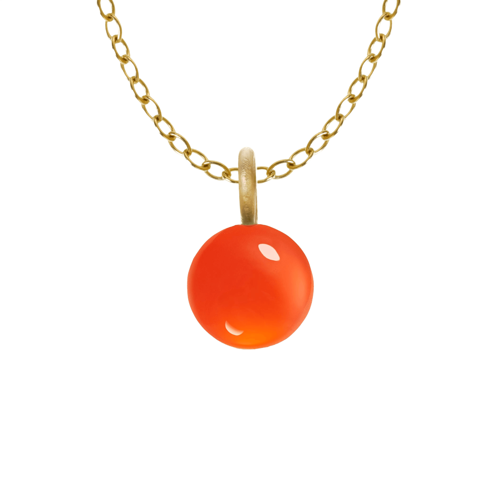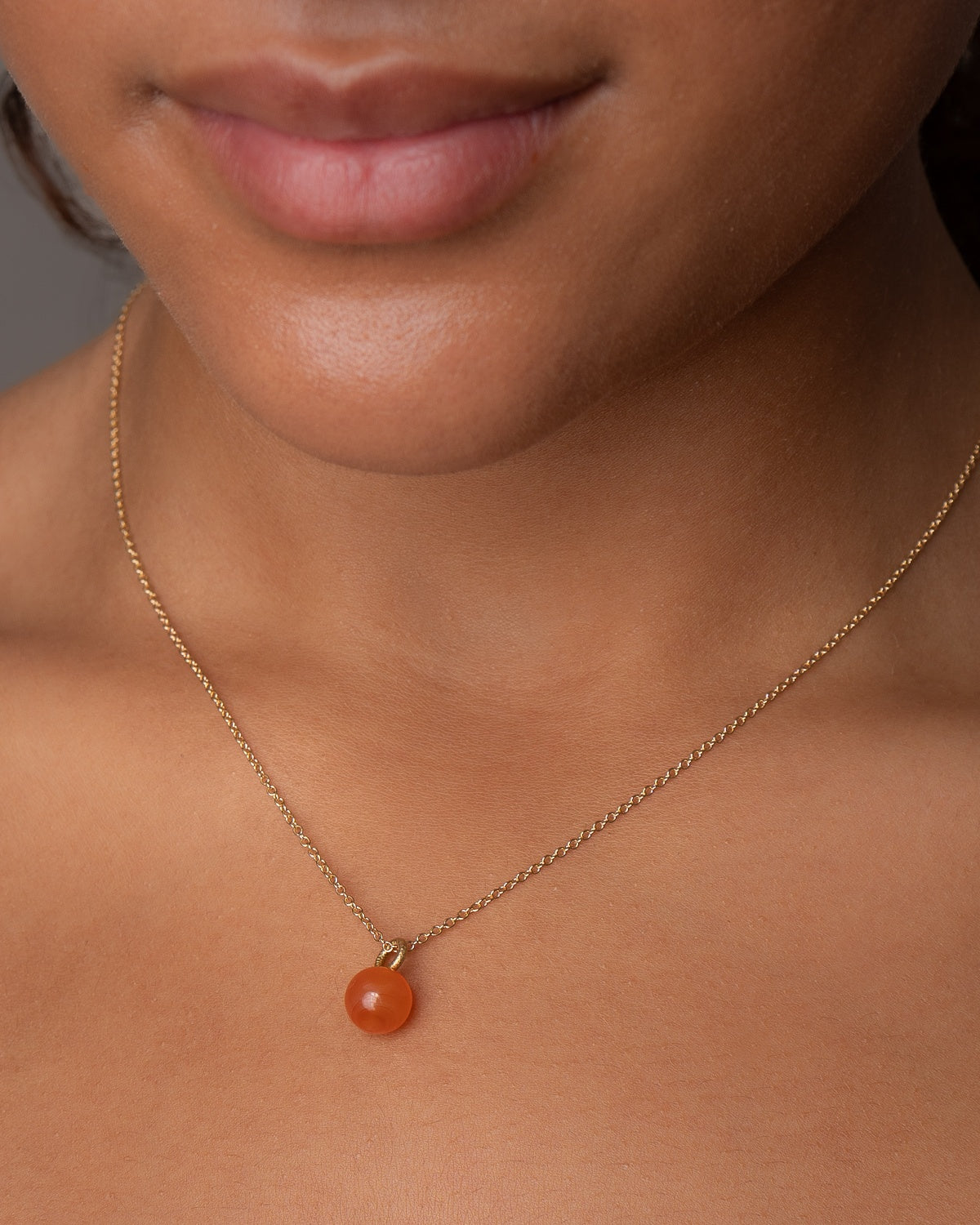 Karneolens og guldets farver komplementerer smukt hinanden og gør vedhængene klædelige til de fleste hudtoner.