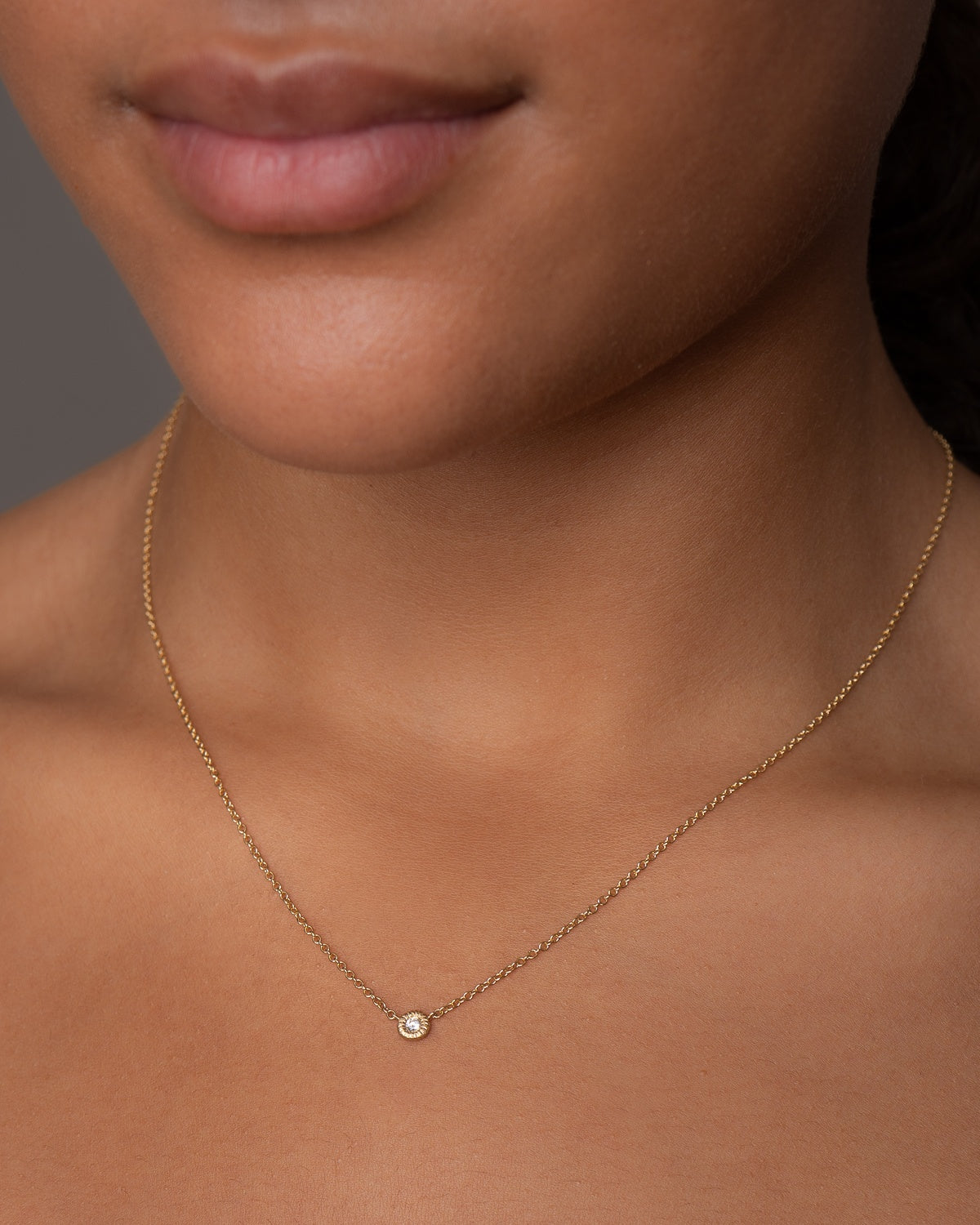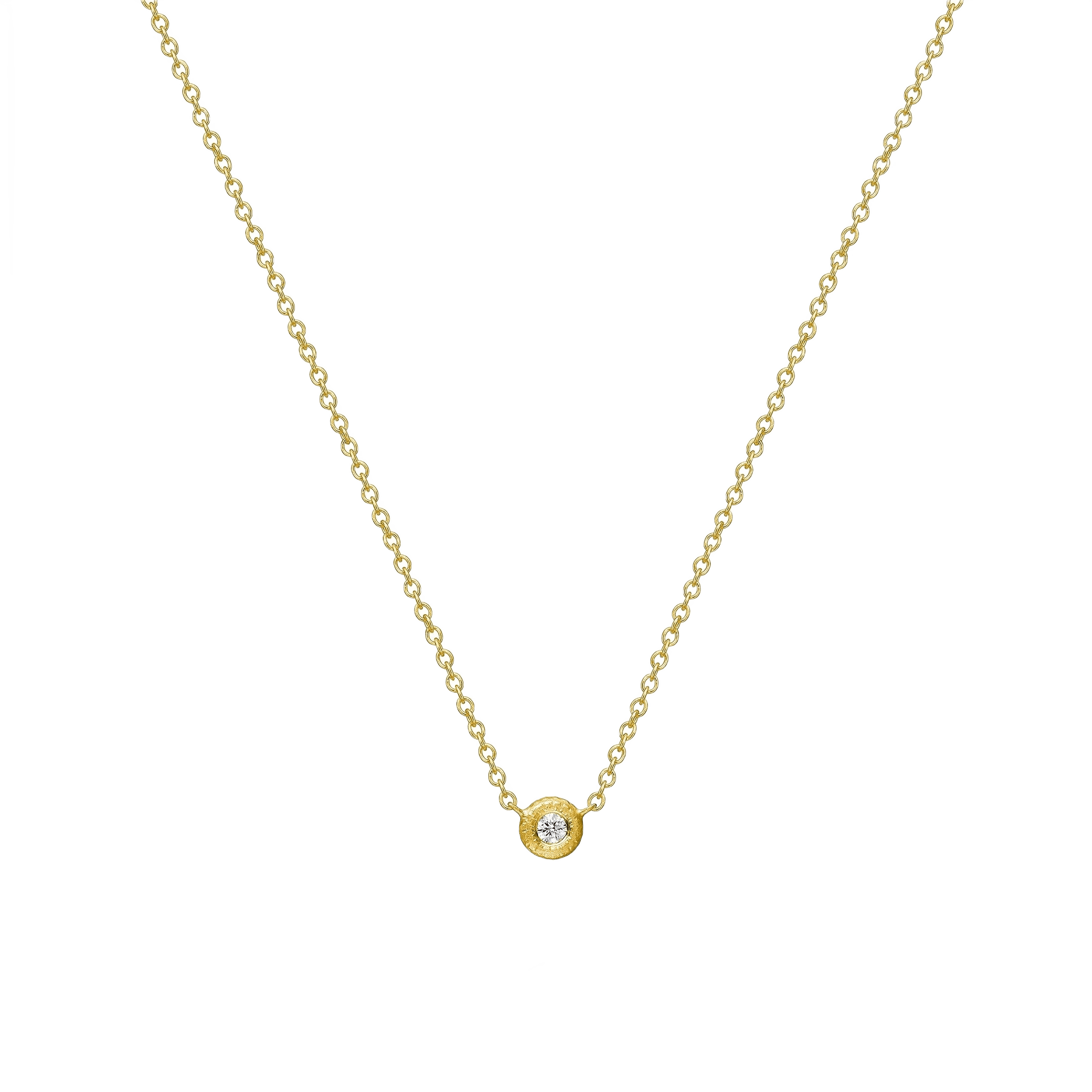 Diskret diamanthalskæde med en enkelt lille brillantslebet diamant på en let og elegant Stream 30 kæde. Diamanten er omkranset af en cirkel af guld med Dulongs håndfilede, riflede signaturoverflade. Den rå overflade i guldet giver et særligt liv til den eksklusive diamants refleksion af lyset.