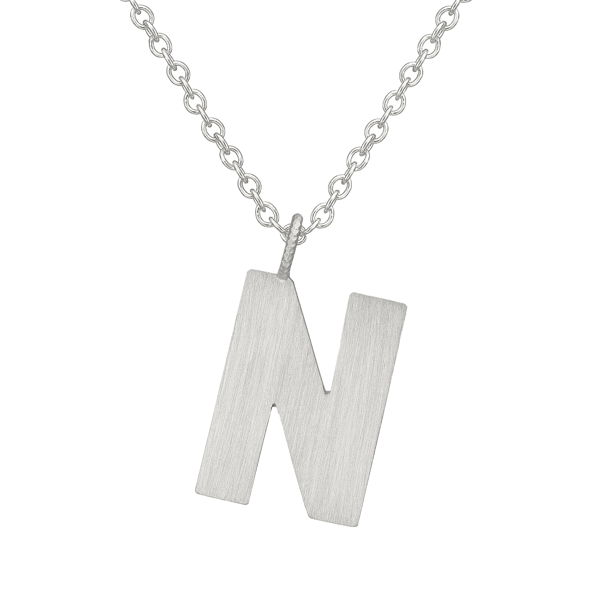 Den silkematte sølvoverflade fremhæver materialets kølige farve og lader det skinne indtagende ud i rummet. Letter N kommer i en enkel og flot Stream 50 kæde, som har en længde på 47 cm.