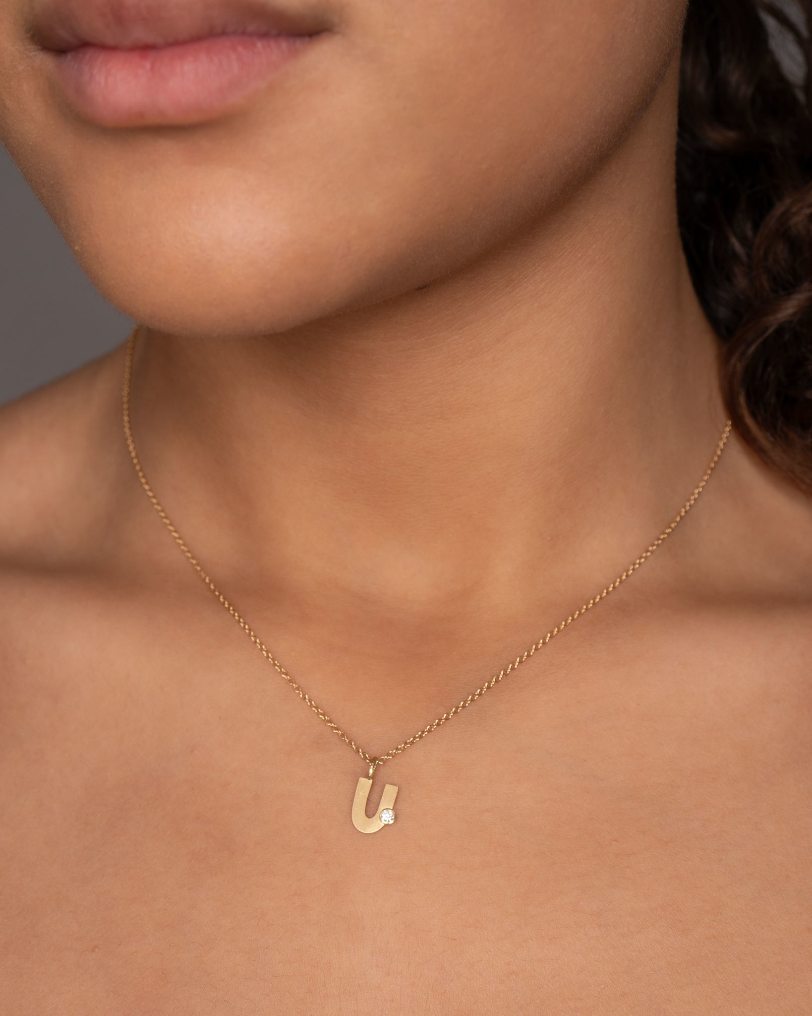 Letter U vedhænget i guld 18 K har en funklende brillant. 0,04 ct. F/G. vs2. ex. cut. Det smukke bogstav i guld 18 K har en varm farve med en dyb glans, som fremhæver gløden i huden naturligt. Den intense brillant reflekterer lyset og får det til at spille smukt i den silkematte overflade.