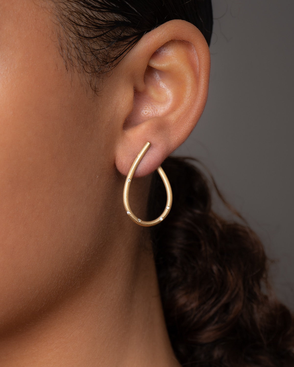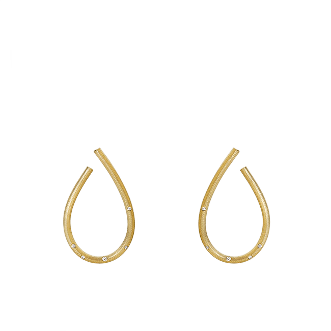 Vores Kharisma øreringe har opnået en ikonisk status på grund af det tidløse og glamourøse design. Kurven, som kendetegner Kharisma, er enkel og smuk. De håndfilede overflader med brillanter leger med lyset, og kollektionen af vedhæng giver mulighed for at sætte et personligt præg på smykket.