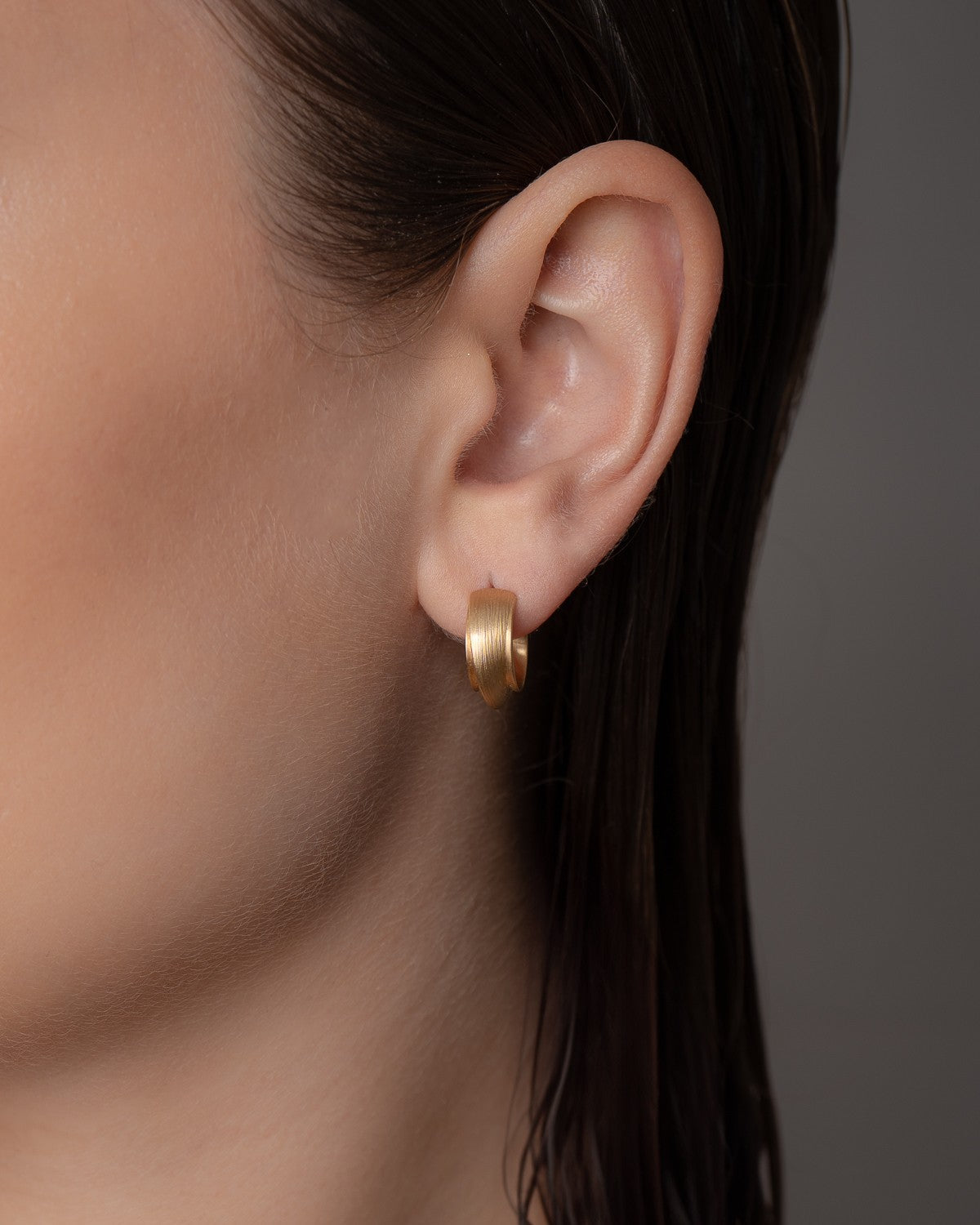 Vega Relief Creol øreringe omkranser øreflippen, hvilket gør dem behagelige og lækre at bære. Creolen har den karakteristiske håndfilede overflade, der giver et organisk udtryk og en spillende refleksion, når hovedet bevæges.