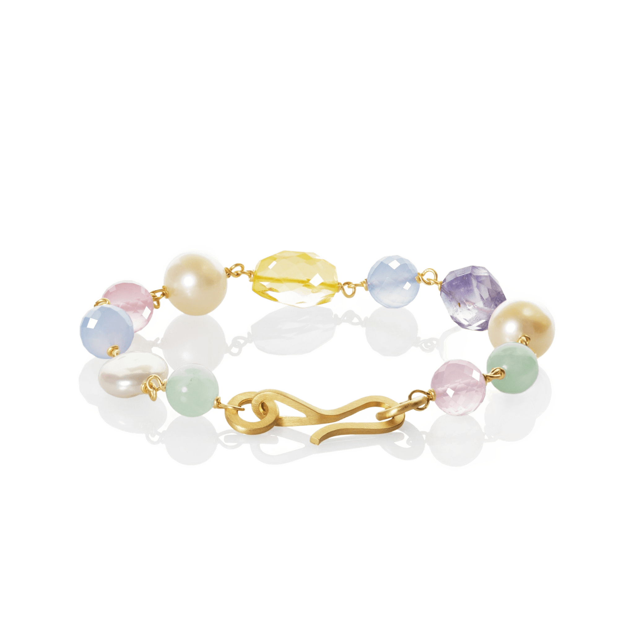 18K guld med ametyst, kalcedon, lemonkvarts, prehnit, rosenkvarts og ferskvandsperler