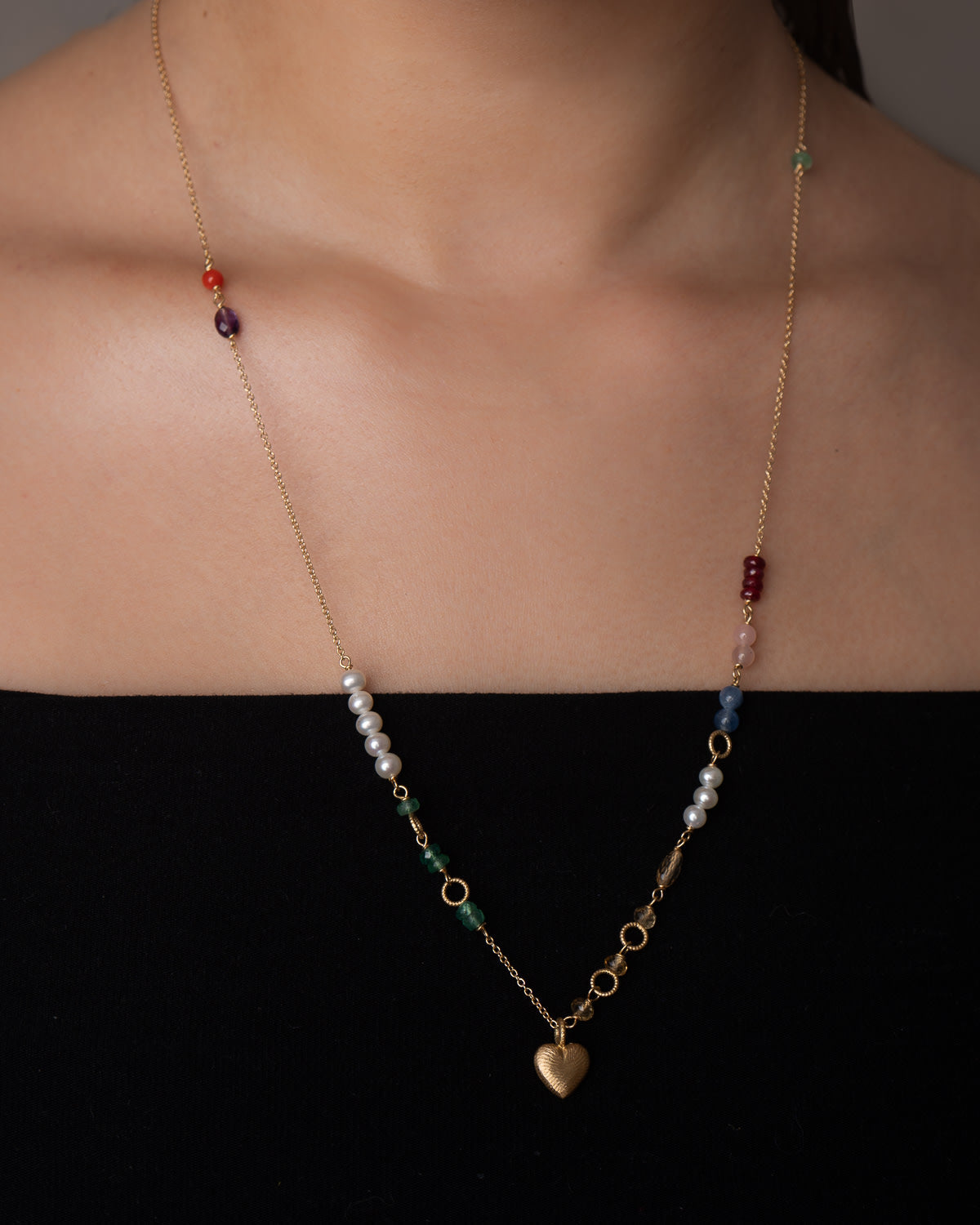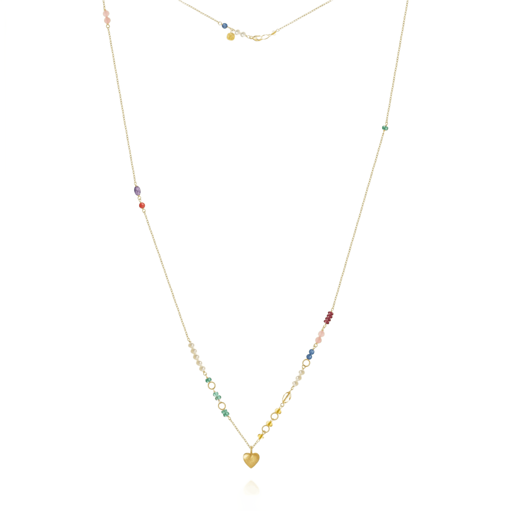 18K guld med smaragd, rubin, guavakvarts, kyanit, ferskvandsperler, citrin, koral og ametyst, guld hjerte.
