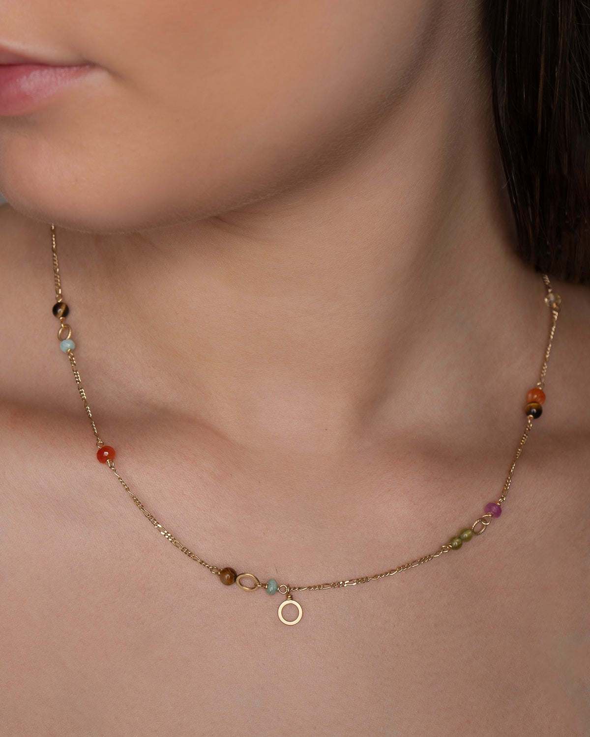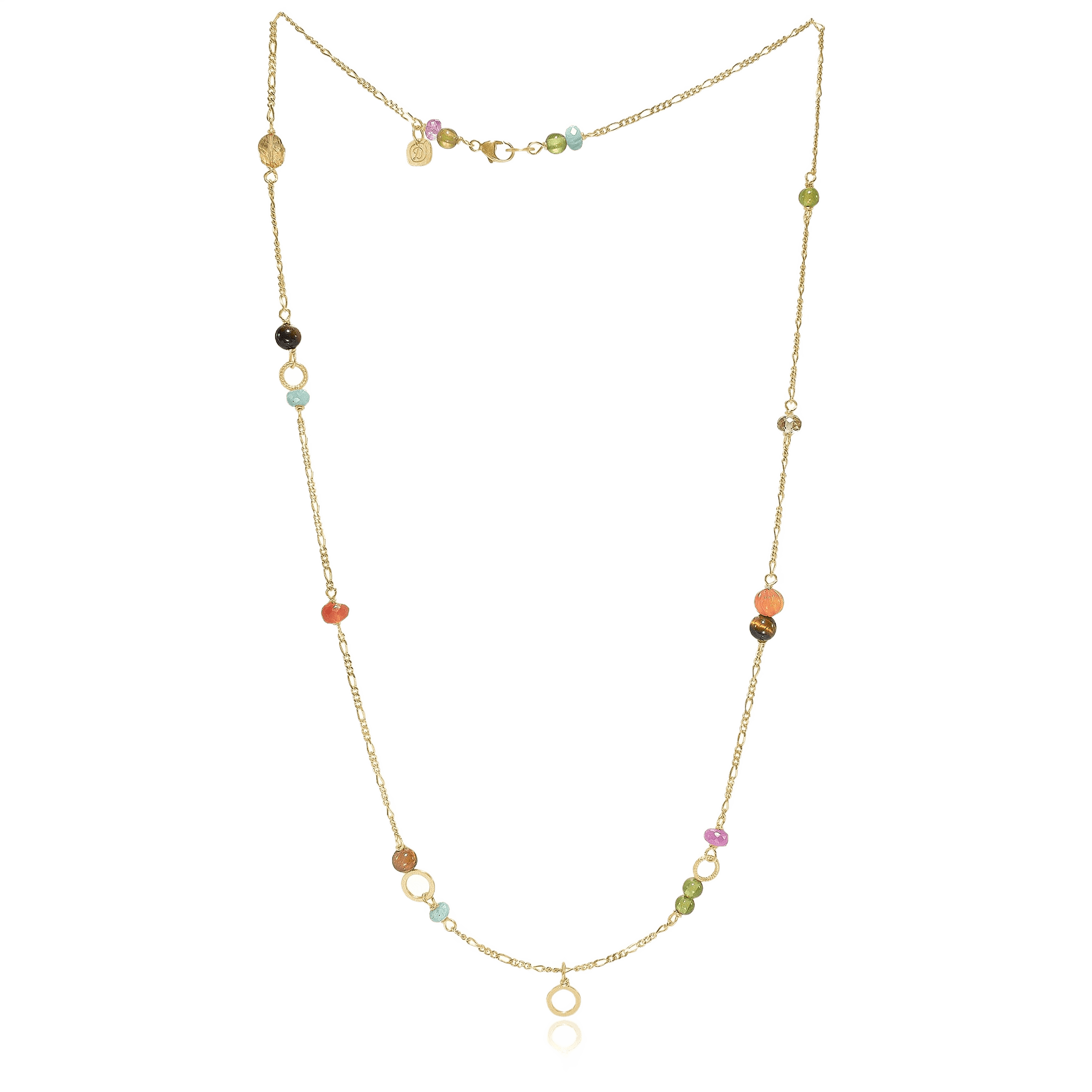 Halskæden er skabt med Mogokrubin fra Myanmar, hvor de mest eksklusive rubiner kommer fra, samt vesuvian, amazonit, tigerøje, karneol og citrin. Stenene er sat i Dulongs ikoniske Thera kæde og fås både i guld 18 K og sølv. Længde 47 cm.Halskæden er utrolig smuk i sig selv, men kan også bæres med halskæder fra andre Dulong kollektioner eller med Dulong øreringe i guld eller med sten. Du kan også skabe et Piccolo Golden Dawn sæt ved at bære halskæden sammen med et af Golden Dawn armbåndene.