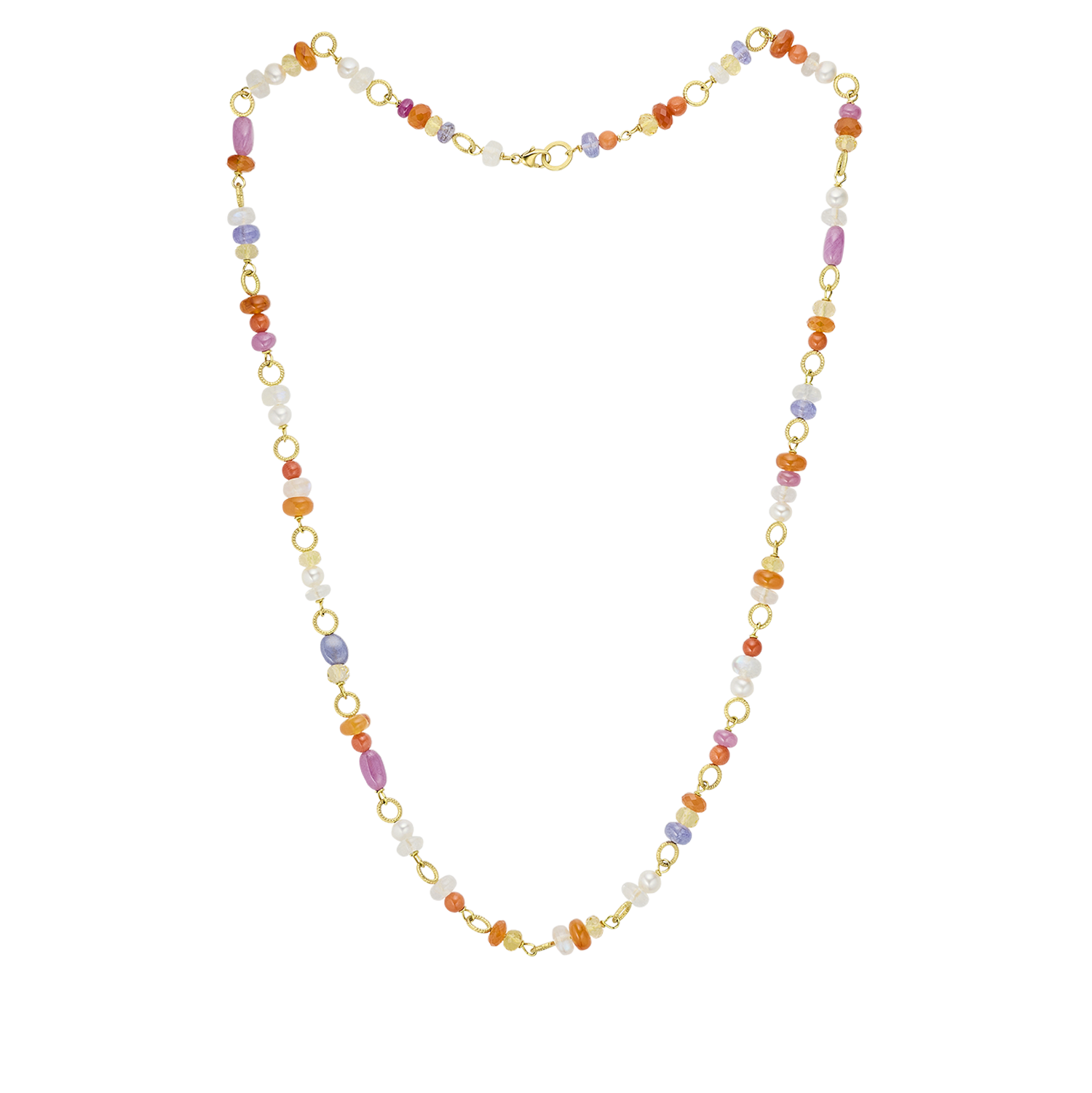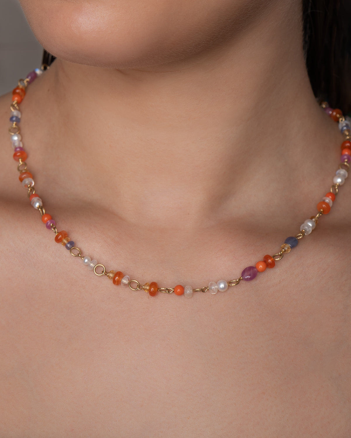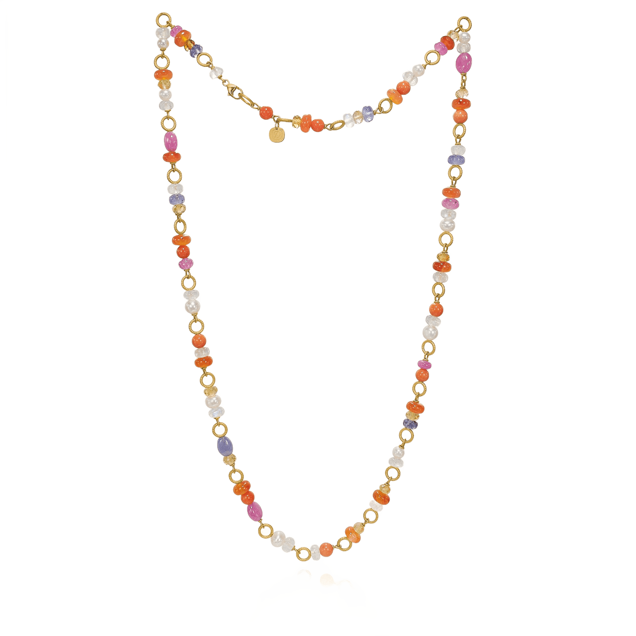 Ltd. edition, med koral, Mogok-rubin, karneol, citrin, blå månesten, tanzanit og ferskvandsperler, 49 cm