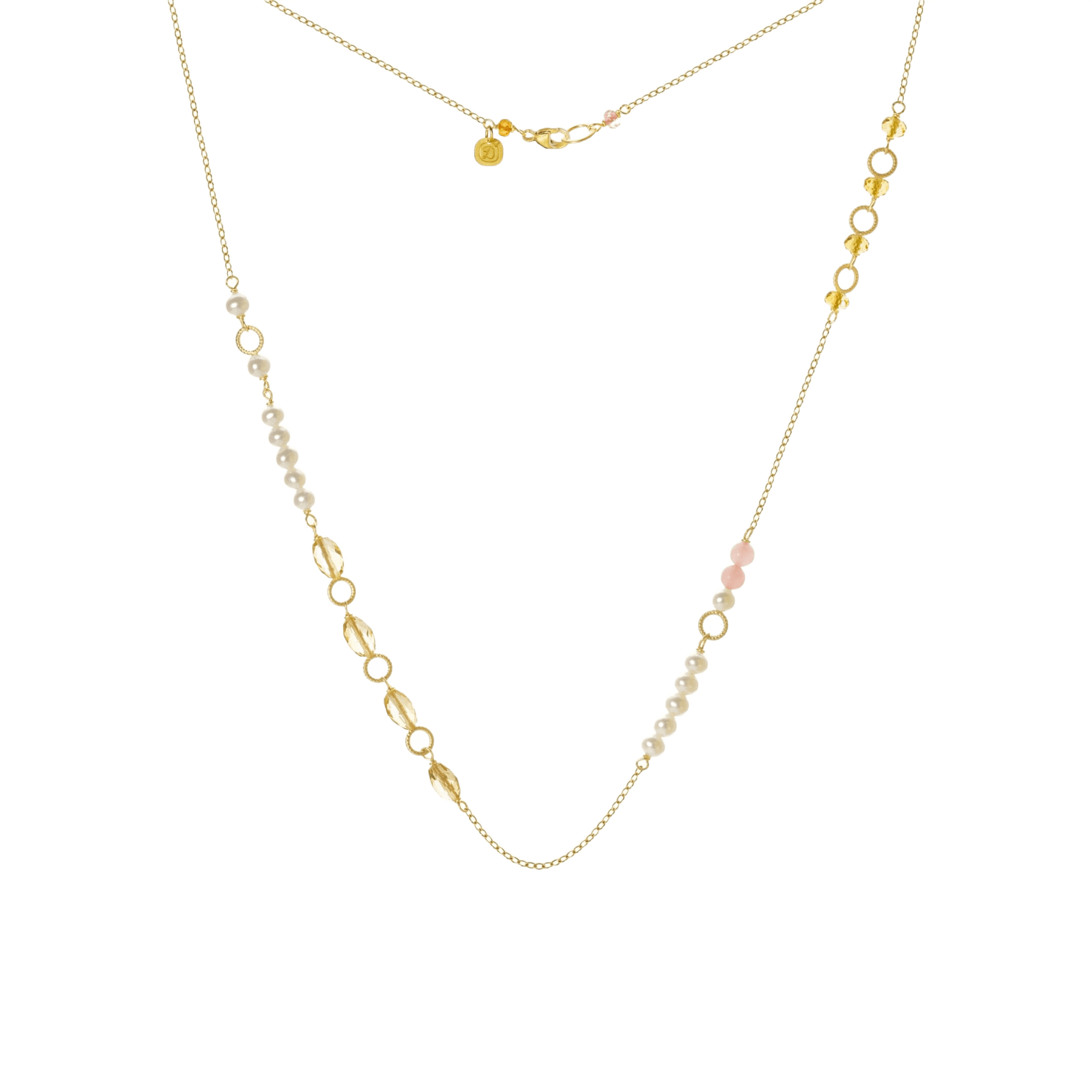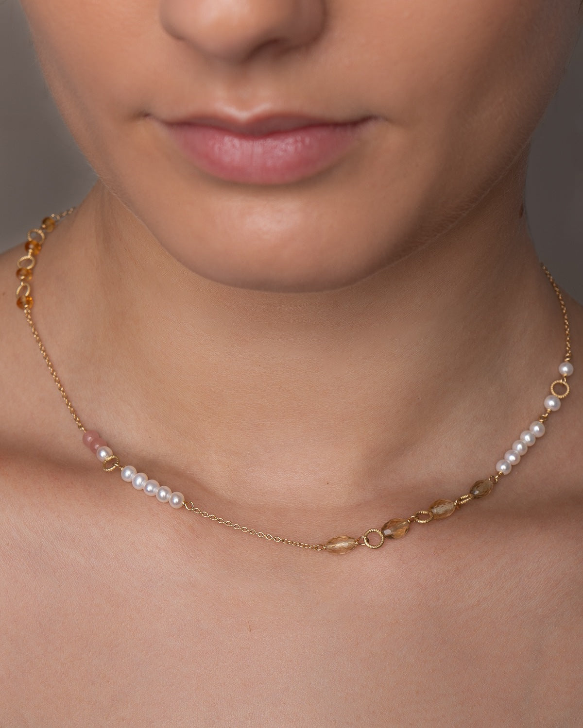Piccolo Mellow halskæden er en moderne fortolkning af den klassiske perlekæde. De feminine perler kombineret med de sarte citriner og safirer giver et romantisk og let udtryk. Halskæden er magisk i bevægelse. Strejf af lysglimt fra de håndfilede ringe i ædelmetal og det smukke skær fra perler og ædelsten lyser skiftevis fra kæden.