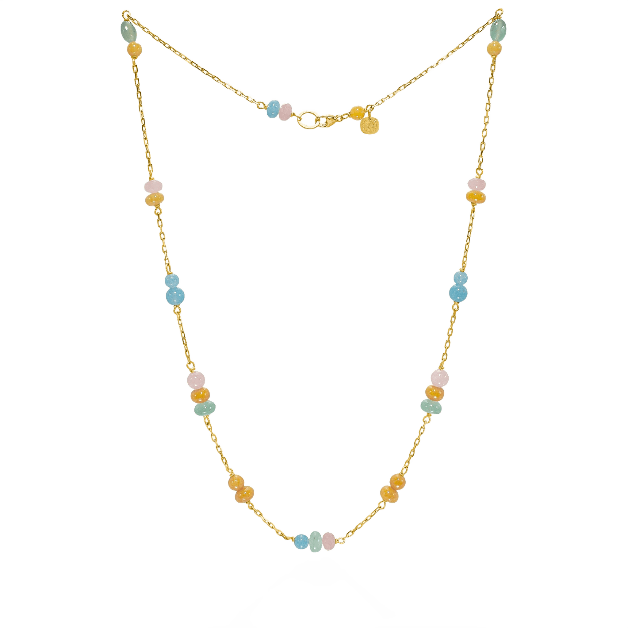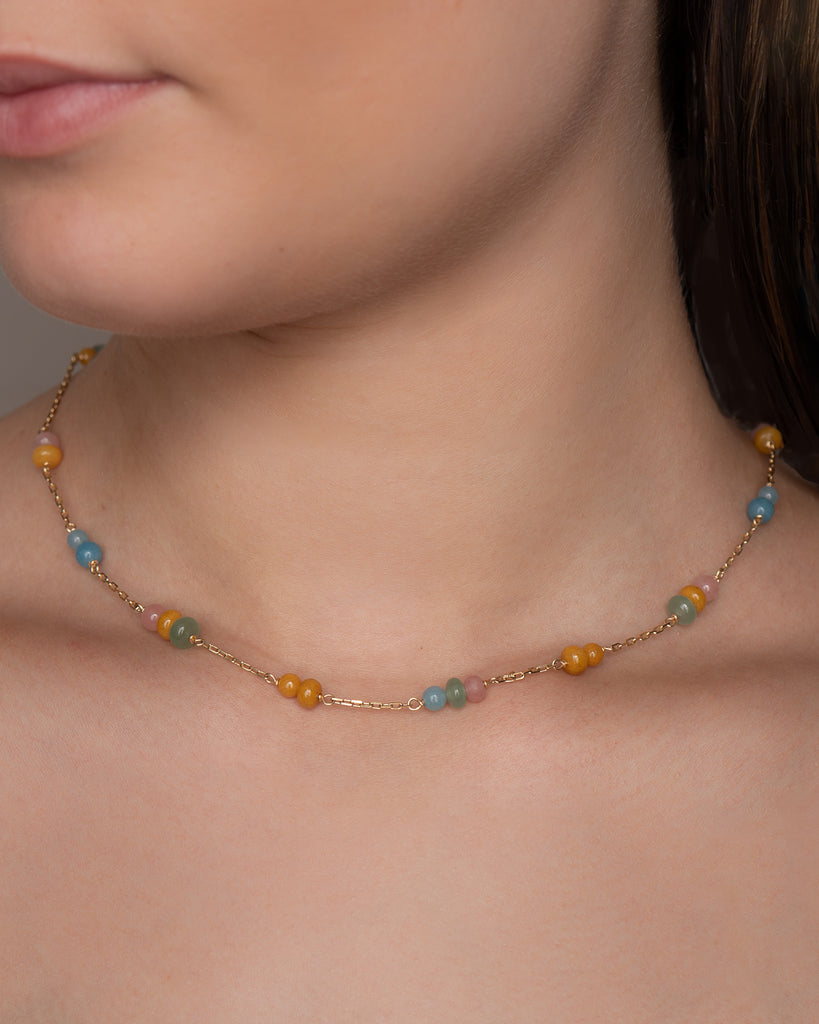 Catena kædernes facetterede led giver Piccolo Melrose halskæden et fyldigt og kraftfuldt udtryk. Kæden brydes af sektioner af blanke perler i aventurin, trolleit og guavakvarts, i en glad farveskala som spejler sommerens farver. Ædelstenene er omhyggeligt udvalgt med inspiration fra afslappede sommerdage i 70’ernes Californien.