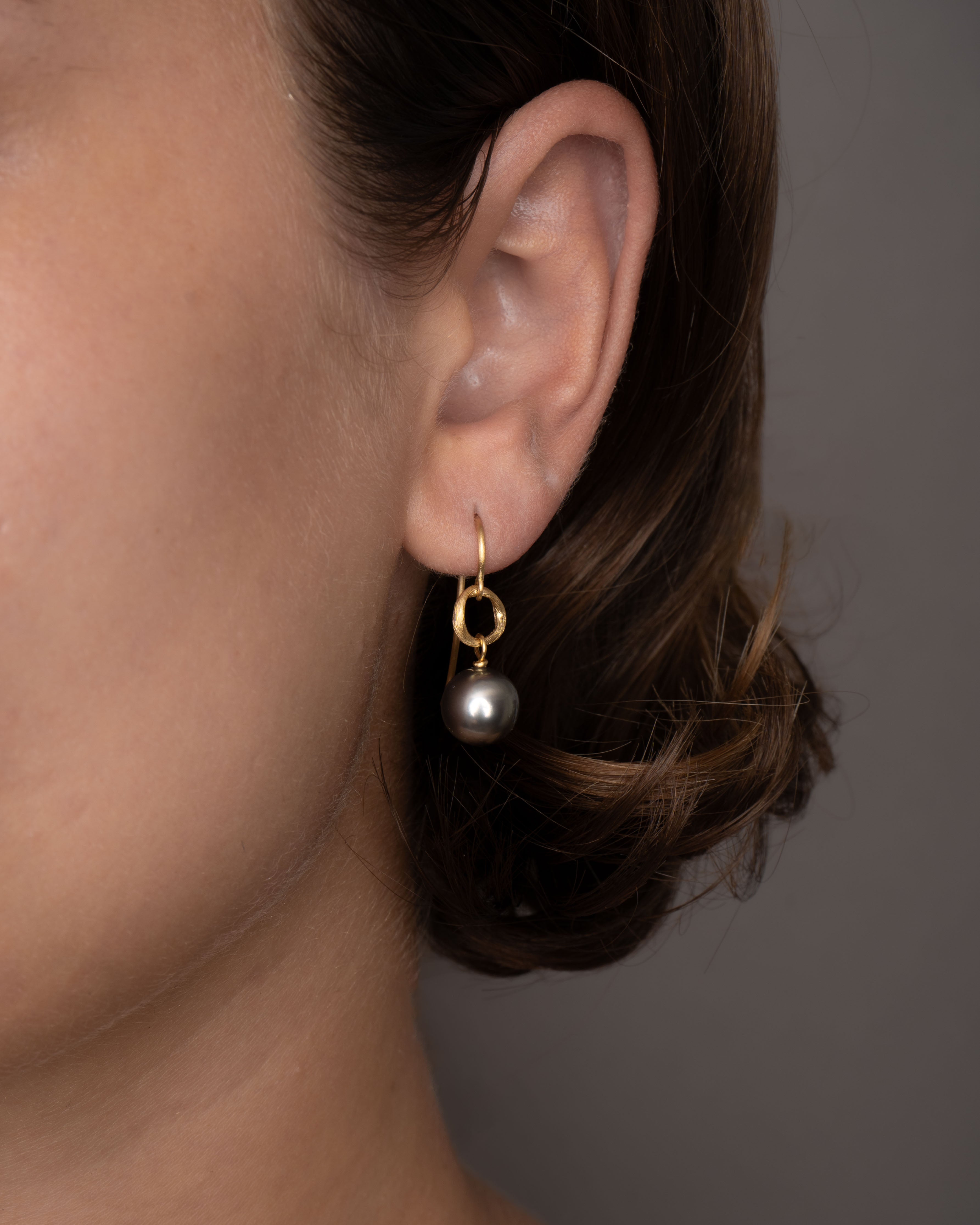 Vega Loop øreringene i 18k guld forener Dulongs karakteristiske børstede overflade med Tahiti perlens eksklusive dybde. De gyldne ringe og de runde perlers bevægelse skaber et livligt og blødt udtryk.