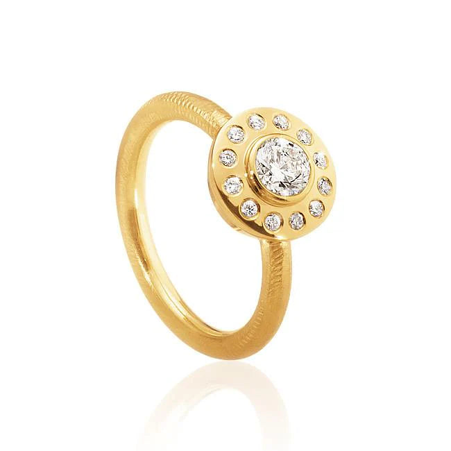 Halo diamantring. Vitguld 18 K med 17 briljantslipade diamanter. Den klassiska, gnistrande trestensringen med Excellent Cut diamanter är med sin vintagelook en vacker och ikonisk diamantring.