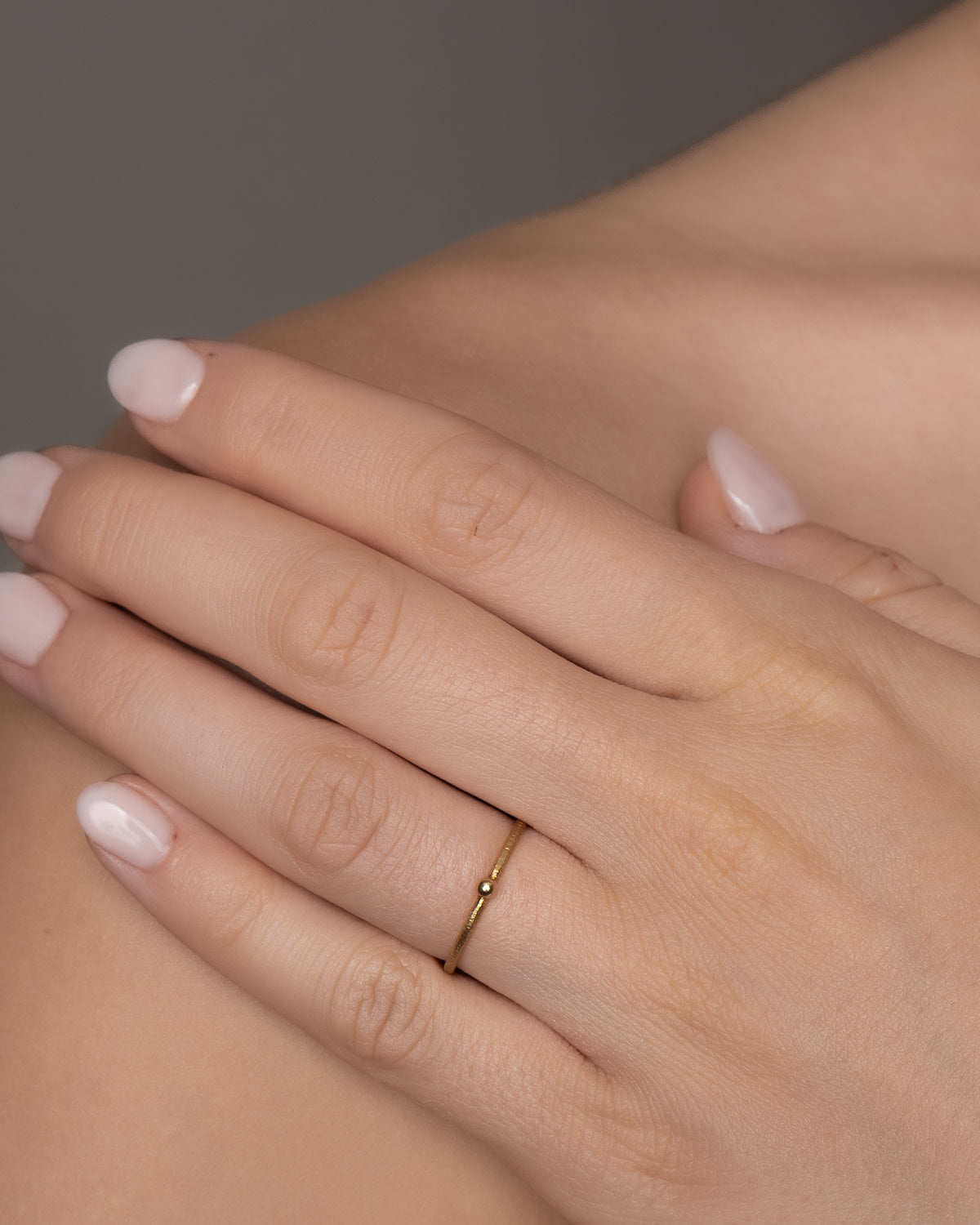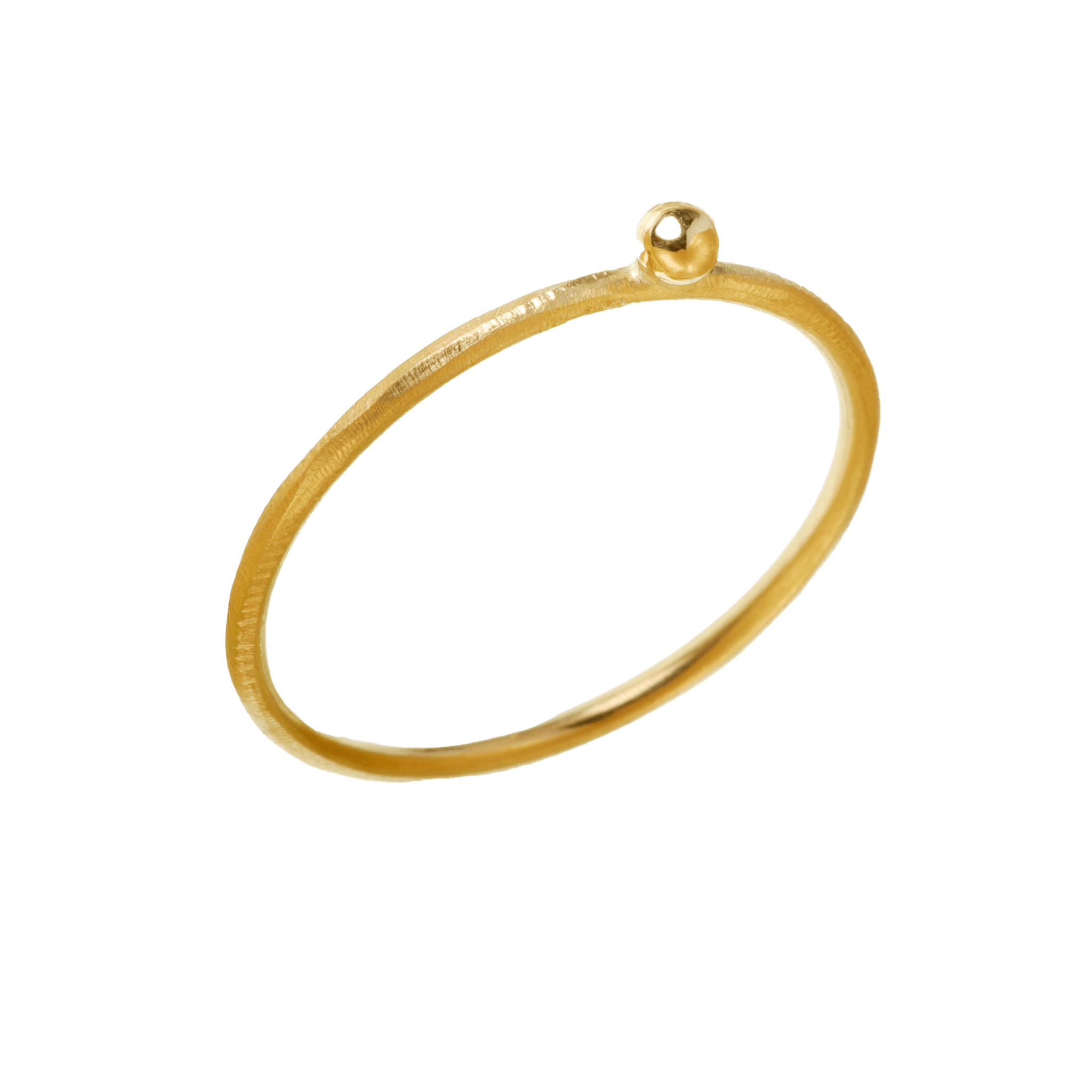 Denne skønne Delphis ring har en enkelt fin kugle, der ligger næsten skødeløst og balancerer som den smukkeste lille dråbe. Delphis ringenes udtryk er let og elegant, hvilket gør dem feminine og klassiske. Guldsmedene har håndfilet overfladen og skabt en kontrast med den lille, fine kugle, der står i højglans, så den reflekterer lyset.