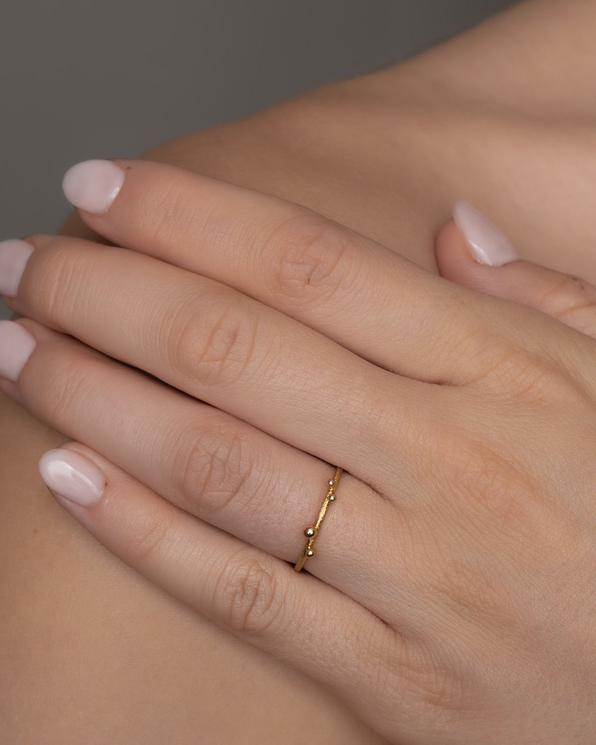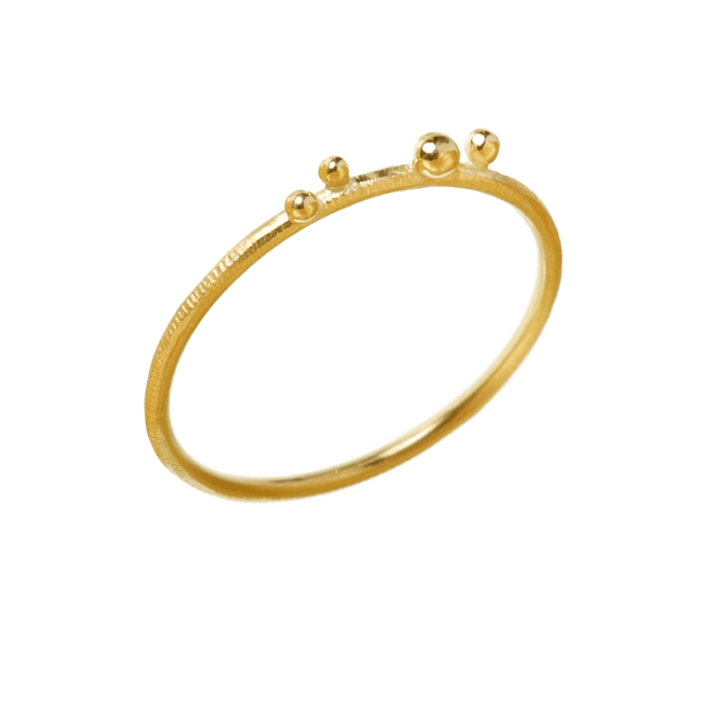 I denne smukke variant har Delphis ringen fire små fine kugler. Delphis ringens særlige udtryk er let og elegant, hvilket gør ringen feminin og klassisk. Guldsmedene har håndfilet overfladen og skabt en kontrast med de små, fine kugler, der står i højglans, så de reflekterer lyset.