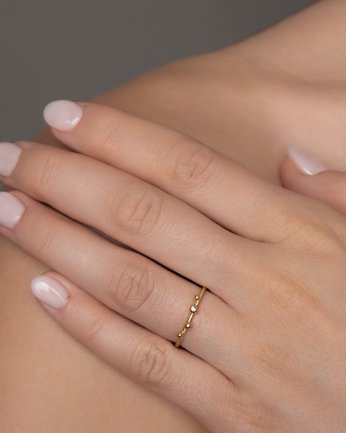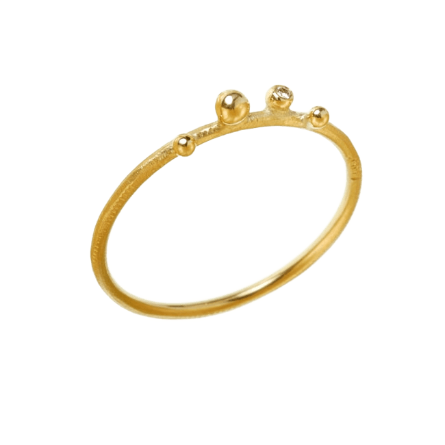 Delphis ringenes særlige udtryk er let og elegant, hvilket gør dem feminine og klassiske. Denne smukke Delphis ring har tre fine, små kugler samt en brillant, der skaber et raffineret lysglimt, når hånden bevæges. Guldsmedene har håndfilet overfladen og skabt en kontrast til de tre fine kugler, der står i højglans, så de reflekterer lyset.