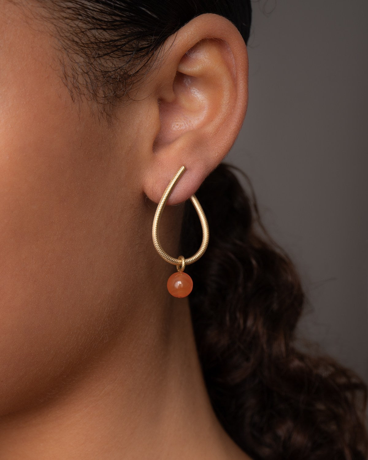 Karneolens og guldets farver komplementerer smukt hinanden og gør vedhængene klædelige til de fleste hudtoner.
