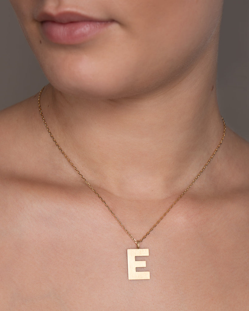 På trods af det skarpe udtryk, falder Letter E vedhænget smukt ind mod huden og gør det behageligt at have på.