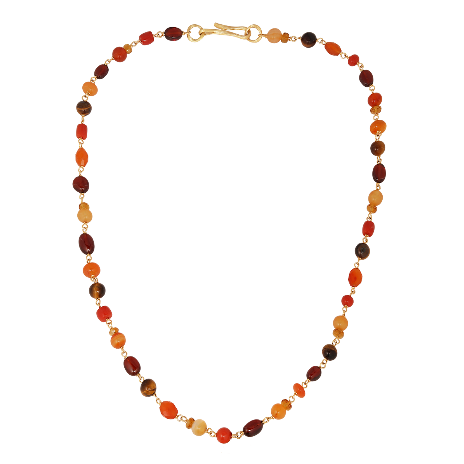 Hver ædelsten er nøje udvalgt af Marianne Dulong og Anja Camilla Alajdi og sammensat i Dulongs atelier, hvilket gør hver halskæde helt unikt. Smykket er prydet med Dulongs nye signaturlås — håndlavet i 18k guld og formet med de bløde kurver og håndpolerede flader, der definerer Dulong — dette fanger lyset i hver bevægelse og gør låsen til et smykke i sig selv.